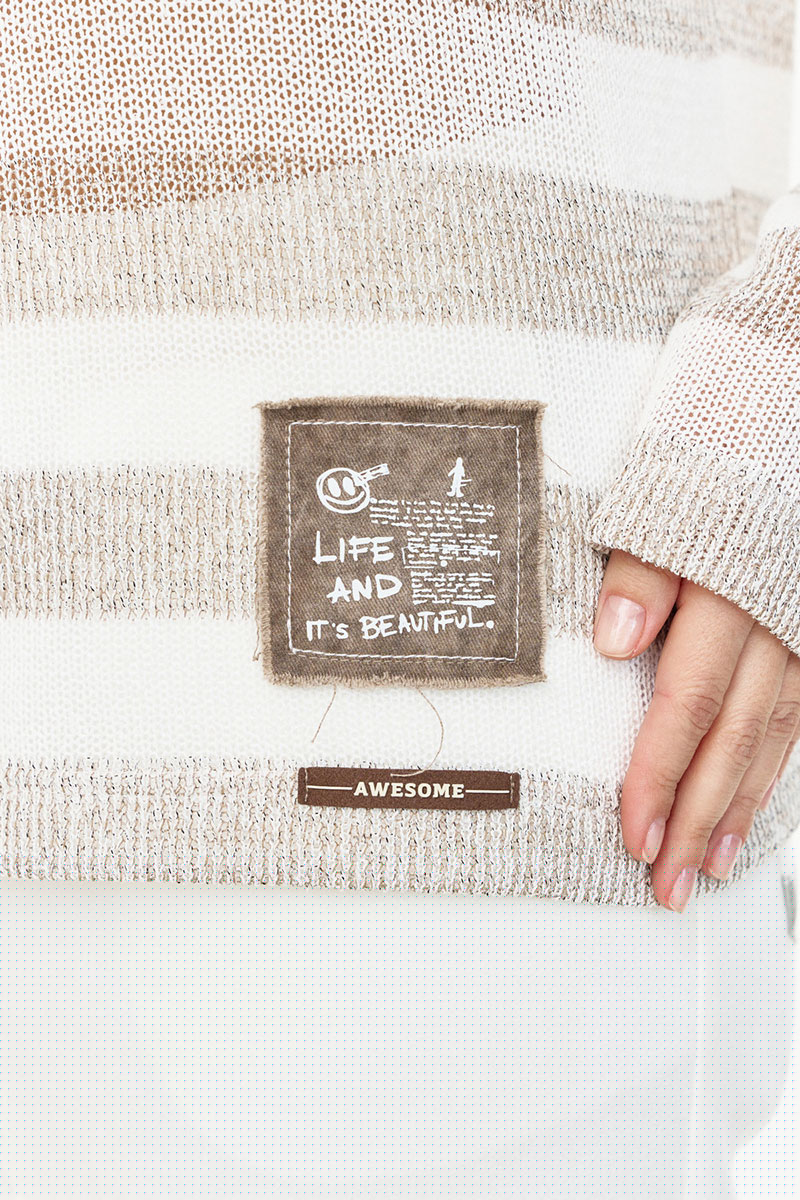 Джемпер из вискозного трикотажа, свободного силуэта и V-образной горловиной. Рукав длинный, линия плеча спущена. Изделие декорировано нашивками с авторским принтом.