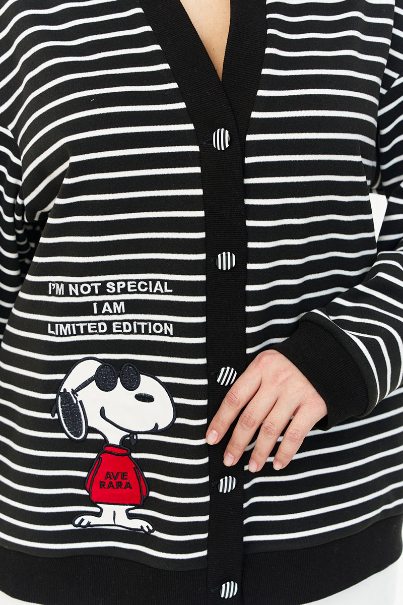 Кардиган из мягкого флиса с густым коротким ворсом, свободного силуэта, с застежкой на пуговицы спереди. Планки и манжеты из отделочного трикотажа. Рукав длинный, линия плеча спущена. На переде справа авторская вышивка с аппликацией.