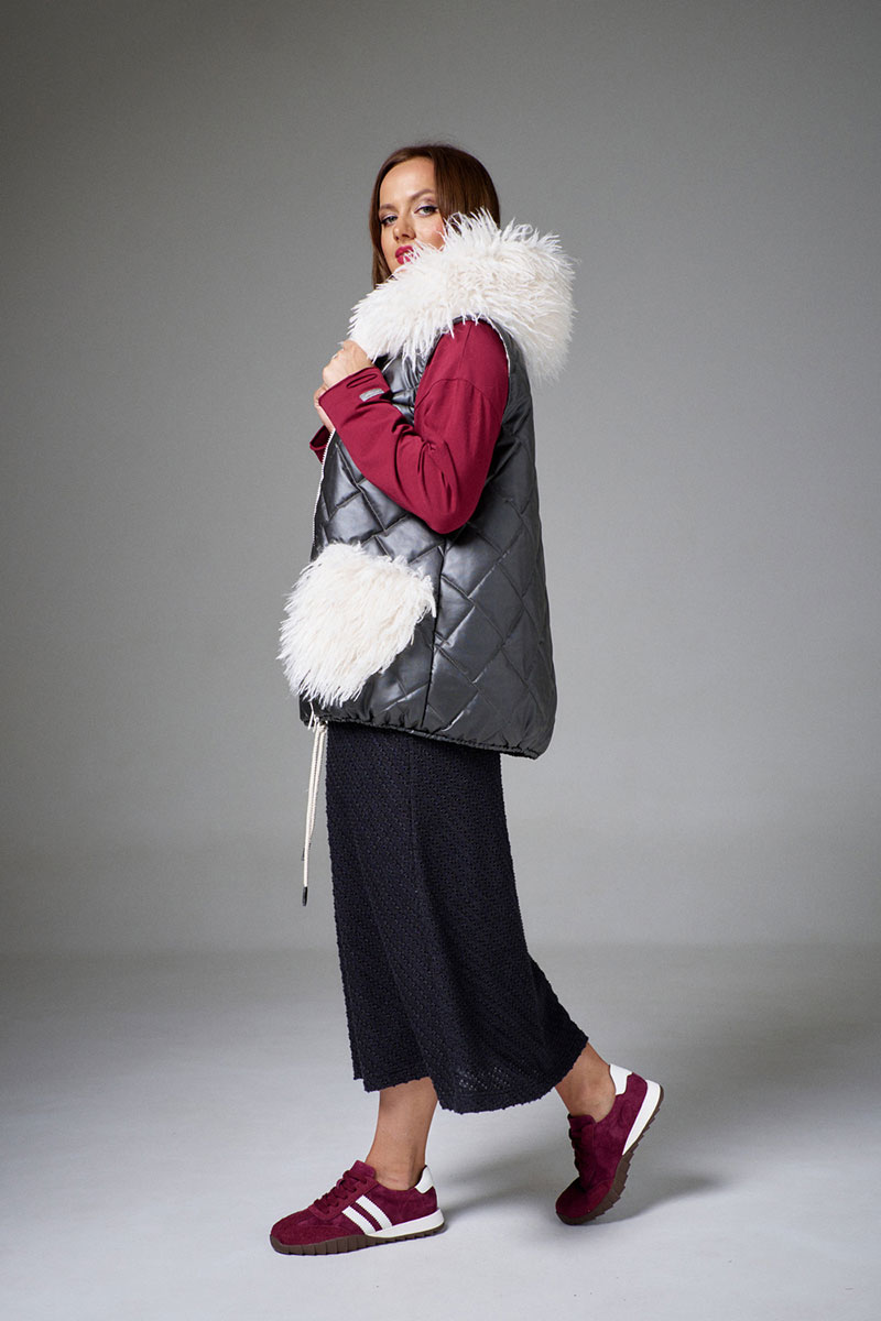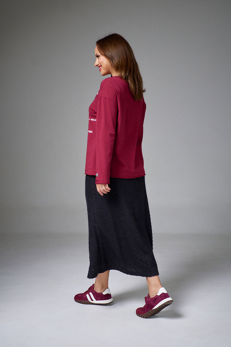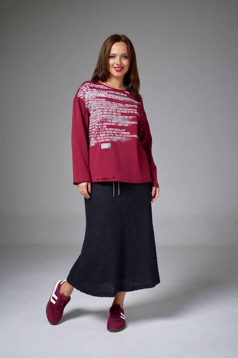 Юбка из ажурного трикотажа, расширенного силуэта, скроеная по косой, длиной миди. Пояс на резинке, с кулисой и серебристым шнуром. Изделие на трикотажной подкладке.