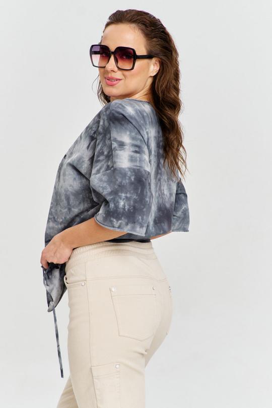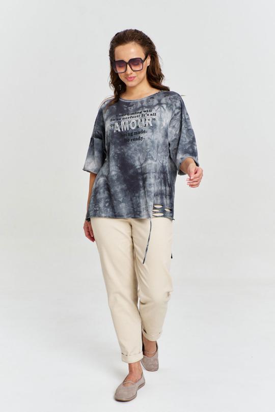 Брюки из хлопкового джинса со стрейчем , с четырьмя функциональными карманами и одним отделочным карманом. Пояс на резинке, с кулисой и шнуром. Изделие декорировано металлическими хольнитенами и контрастными отделочными строчками.