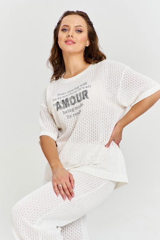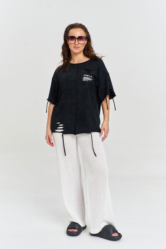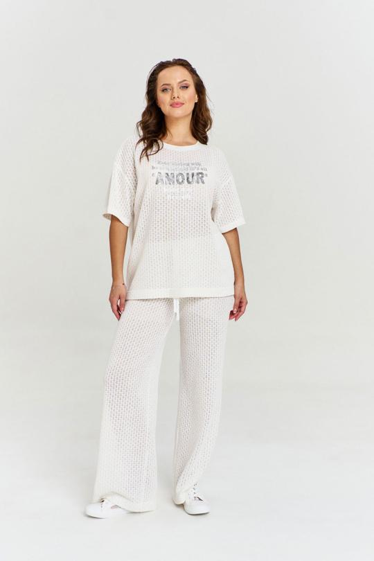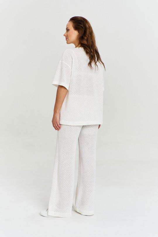 Брюки из ажурного вискозного трикотажа, прямого силуэта, с поясом на резинке со шнуром. Функцию подкладки брюк выполняют трикотажные шортики телесного цвета.