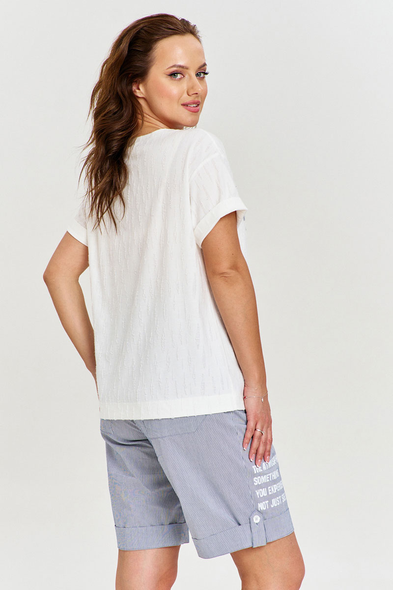 Шорты из легкой хлопковой ткани со стрейчем, длиной до колена, с четырьмя функциональными карманами с хлястиками и пуговицами. Пояс широкий, на резинке, с кулисой и шнуром. Длина шорт регулируется отложной манжетой, фиксирующейся с помощью хлястика. Изделие декорировано авторским шрифтовым принтом.