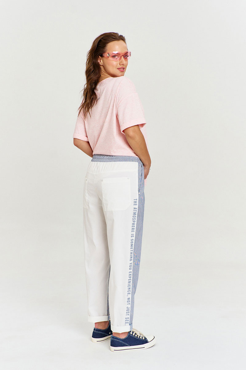 Брюки, силуэтной формы "бананы", выполнены из двух видов материала: задняя часть из хлопковой ткани цвета экрю, передняя из ткани в мелкую полоску. В изделии четыре функциональных кармана. Пояс широкий, на резинке, сс кулисой и шнуром. По бокам брюк шрифтовой авторский принт, эффектно сочетающий между собой два вида ткани.