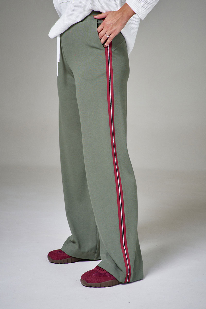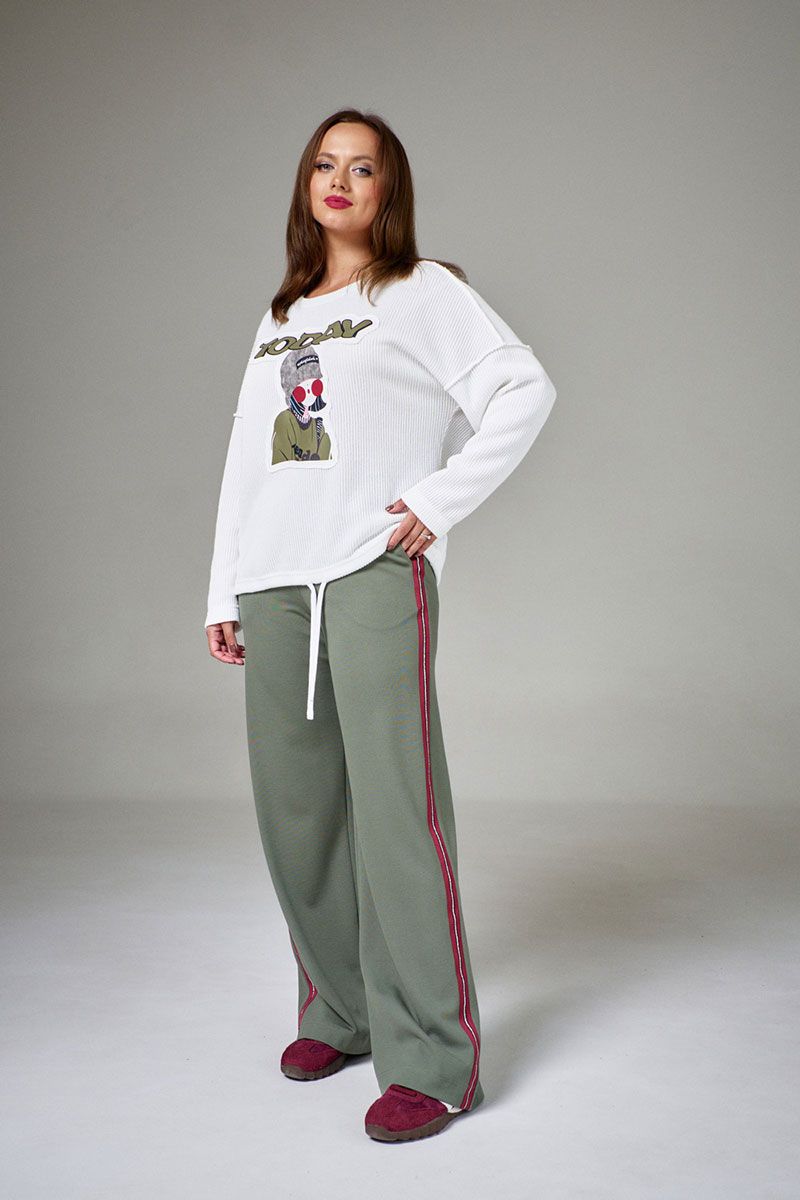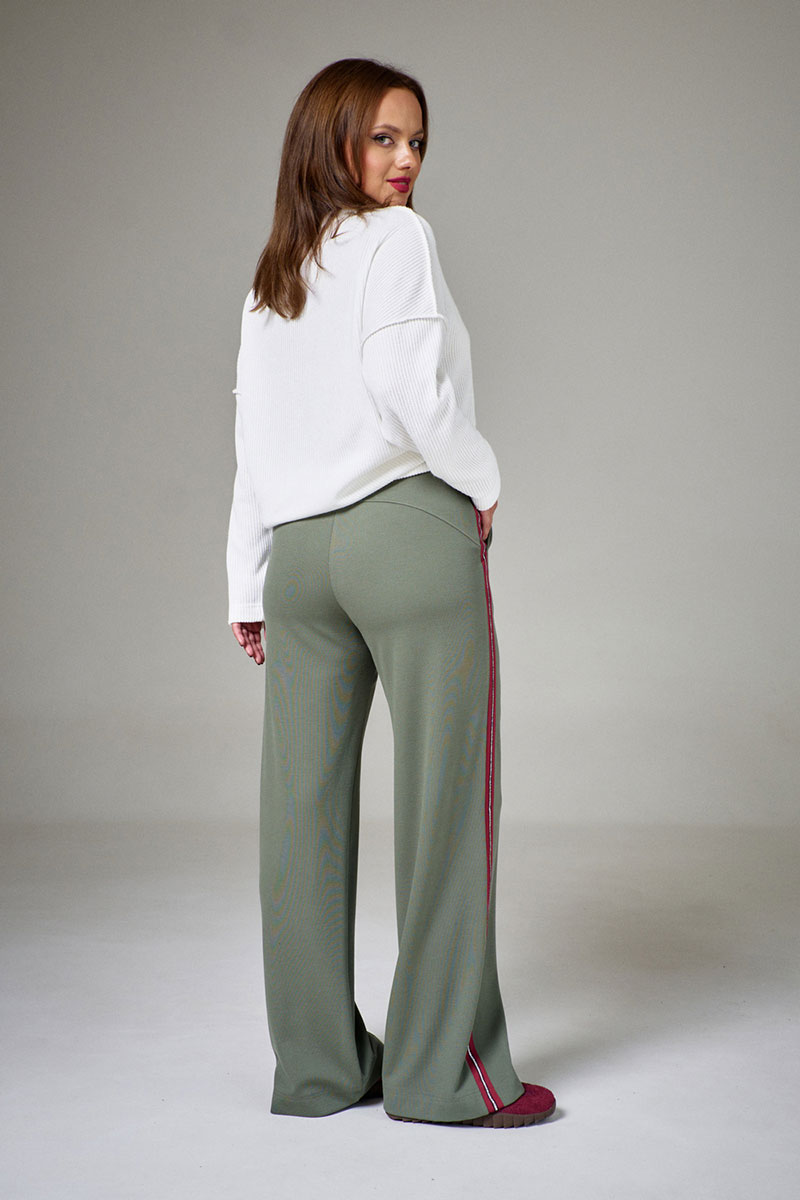 Джоггеры из плотного, но пластичного трикотжа, прямого силуэта, с боковыми карманами спереди, и фигурной кокеткой сзади. Пояс с резинкой. В боковых швах лампасы из отделочной тесьмы.