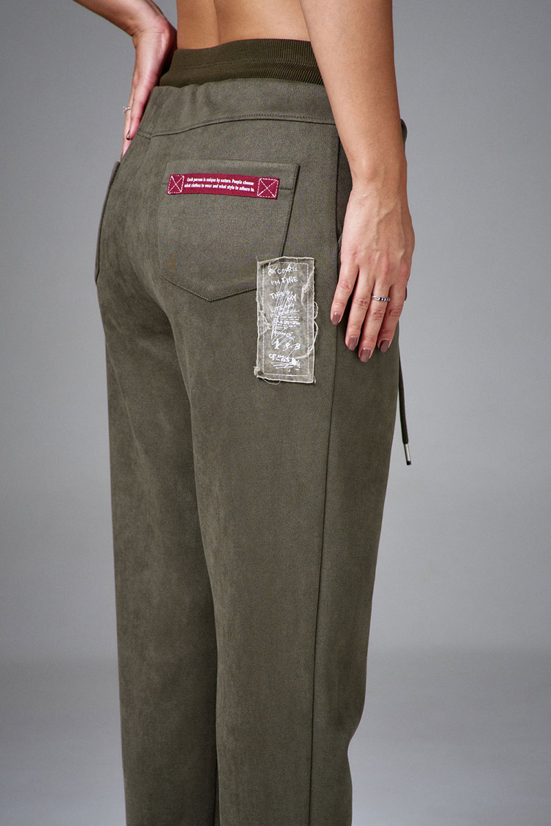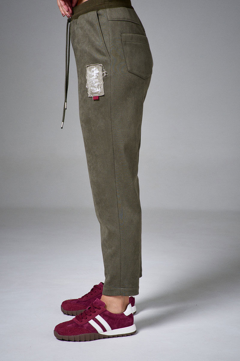 Брюки из экозамши на плотной трикотажной основе, с четырьмя функциональными карманами и трикотажным поясом на резинке, с кулисой и шнуром. Изделие декорировано авторскими нашивками.