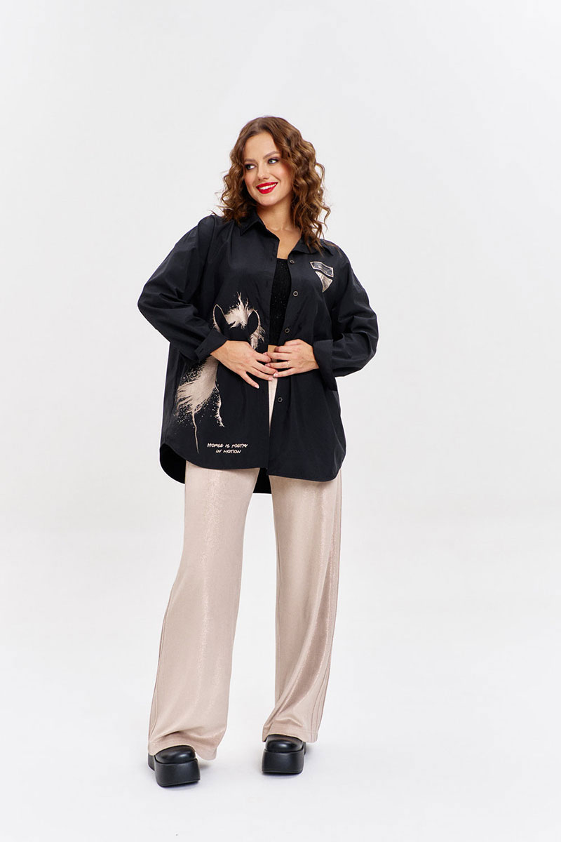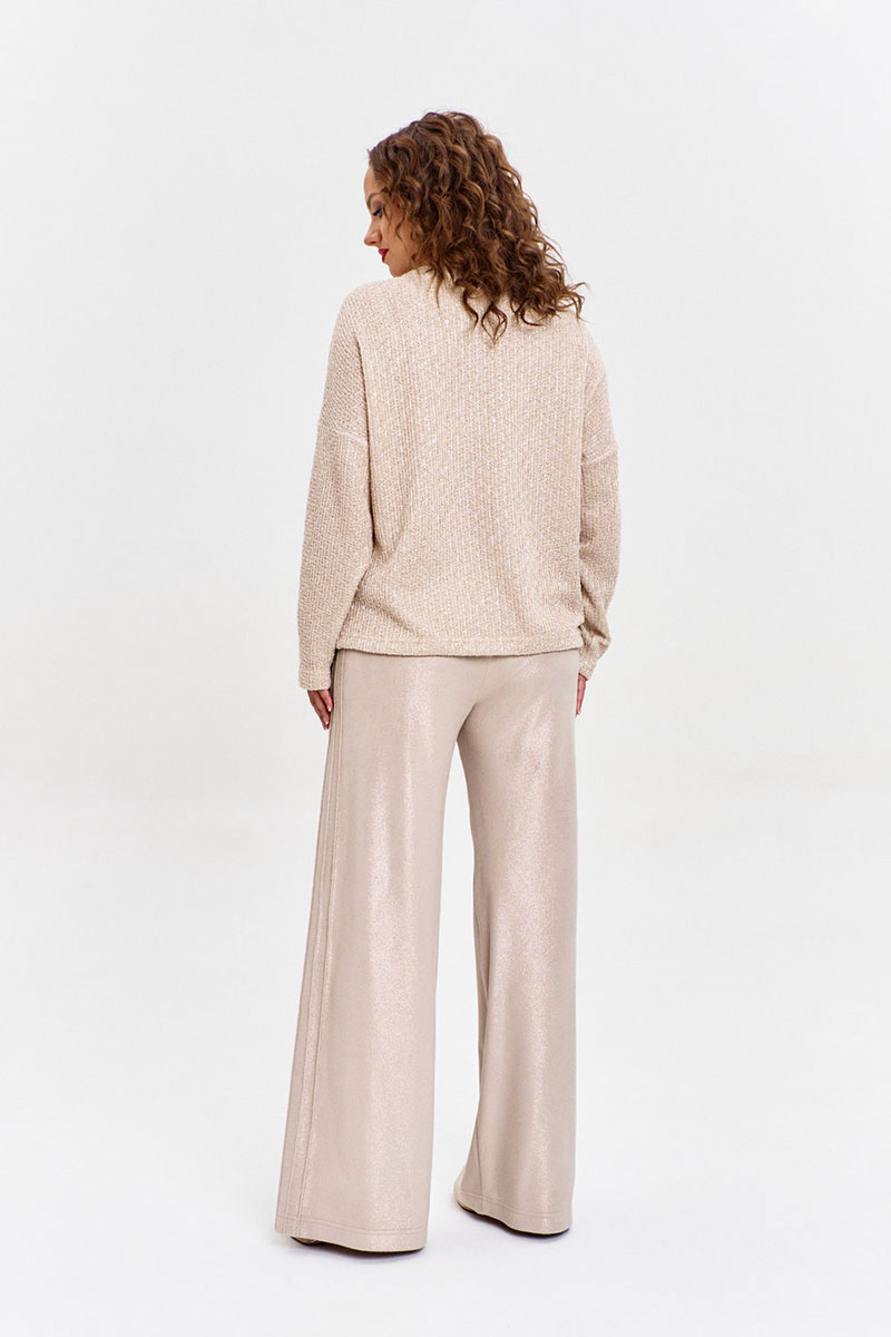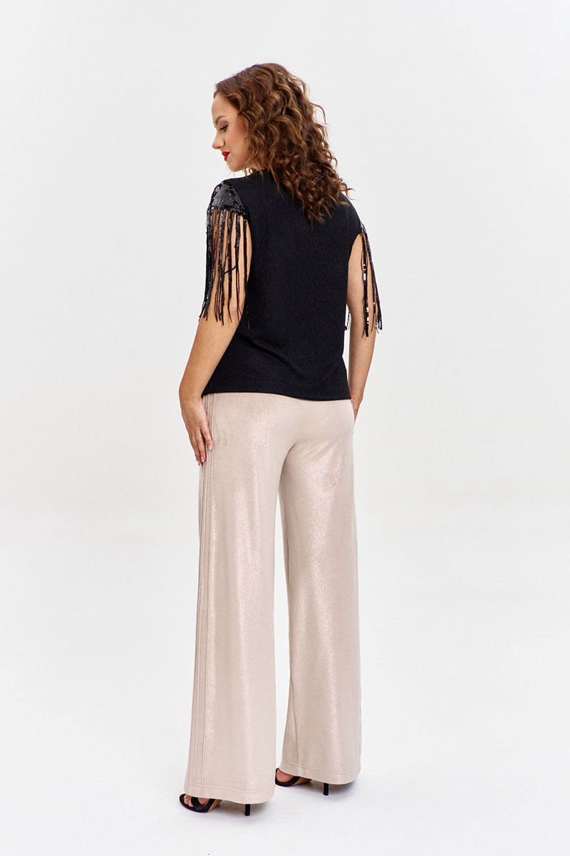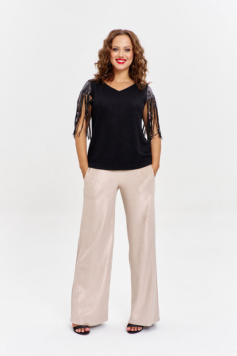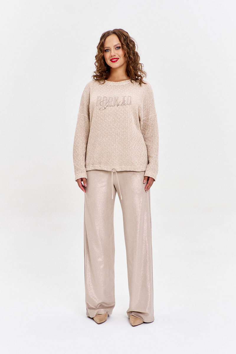 Джоггеры из коротковорсового велюра с эффектным напылением, прямого силуэта, с боковыми карманами и отрезной кокеткой. Пояс на резинке. Изделие декорировано защипами по всей длине брюк.