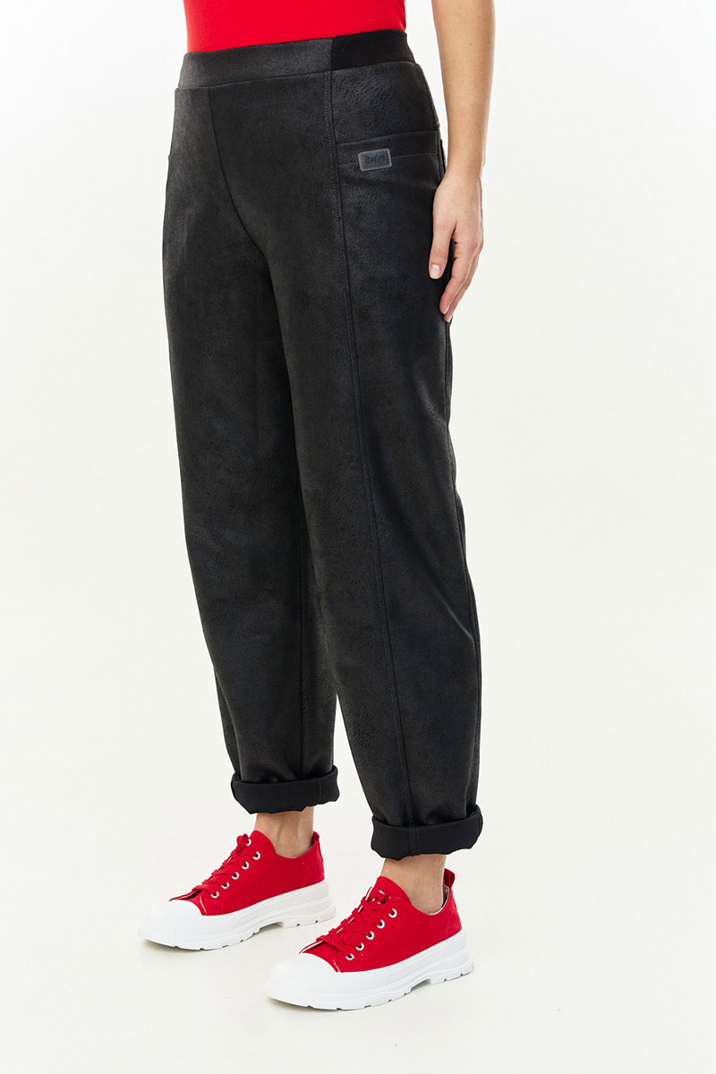 Брюки из плотного эластичного трикотажа с покрытием "нубук", прямого силуэта, зауженные к низу. Пояс с трикотажной вставкой с резинкой. Карманы брюк в боковых вставках. Изделие декорированонашивкой с авторским принтом.