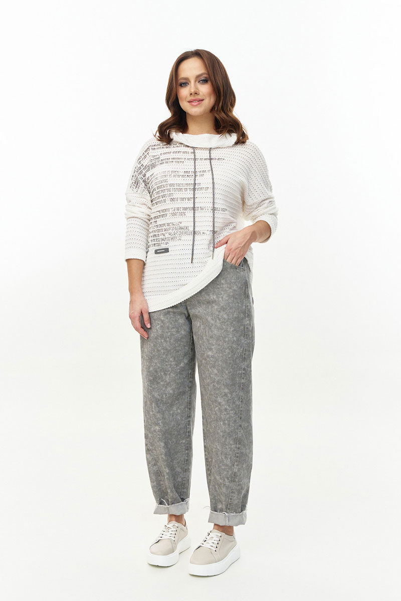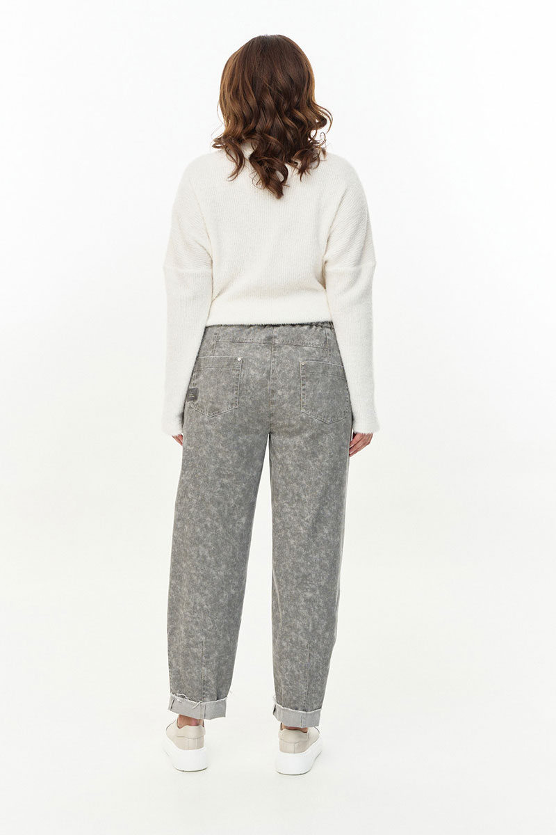 Джинсы из "мраморного" хлопка, с четырьмя функциональными карманами и поясом с резинкой на спинке. Боковые швы брюк переходят на перед. Изделие проходит энзимную стирку.