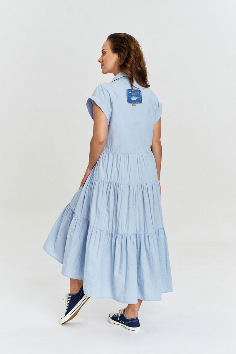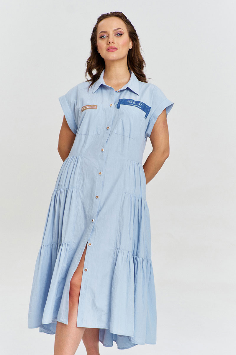 Платье из 100% хлопка с легким крэш эффектом, длиной миди спереди и удлиненной спинкой, с застежкой на пуговицы по переду до низа и рубашечным воротником. Рукав короткий, цельнокроеный, с притачной манжетой. Платье отрезное по линии талии. Низ изделия - сосборенные воланы ярусами. На переде накладные карманы. Изделие декорировано авторскими джинсовыми нашивками с необработанными срезами.