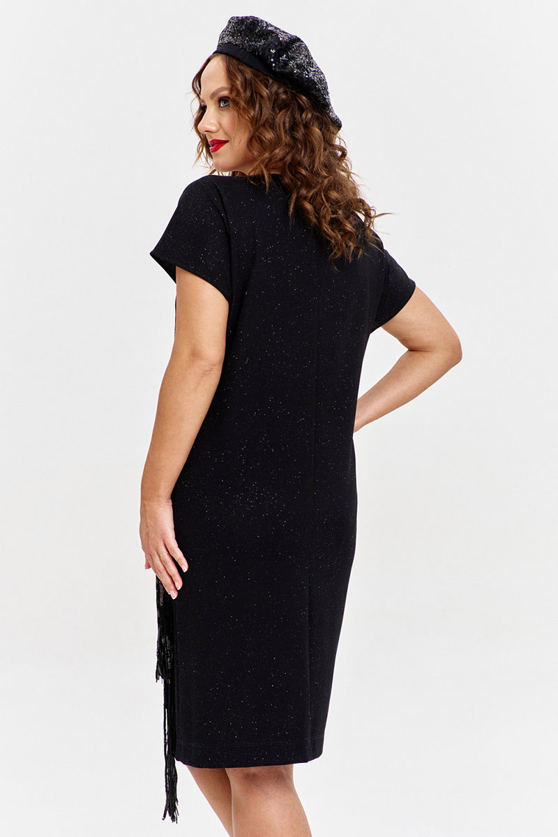 Платье из трикотажного полотна с эффектным мерцанием, прямого силуэта, со спущенным рукавом и круглой горловиной. Перед изделия с накладным карманом из пайеток с бахромой, каскадом спускающимся до низа изделия.