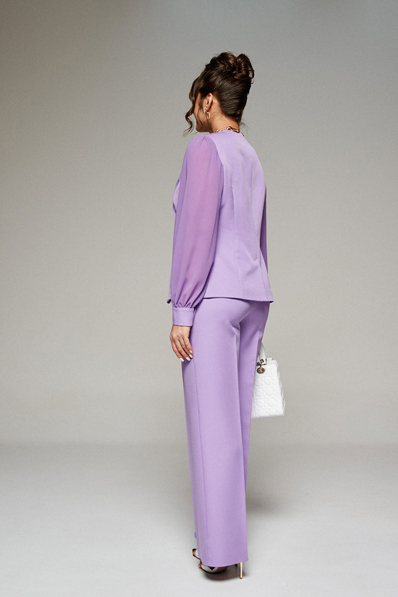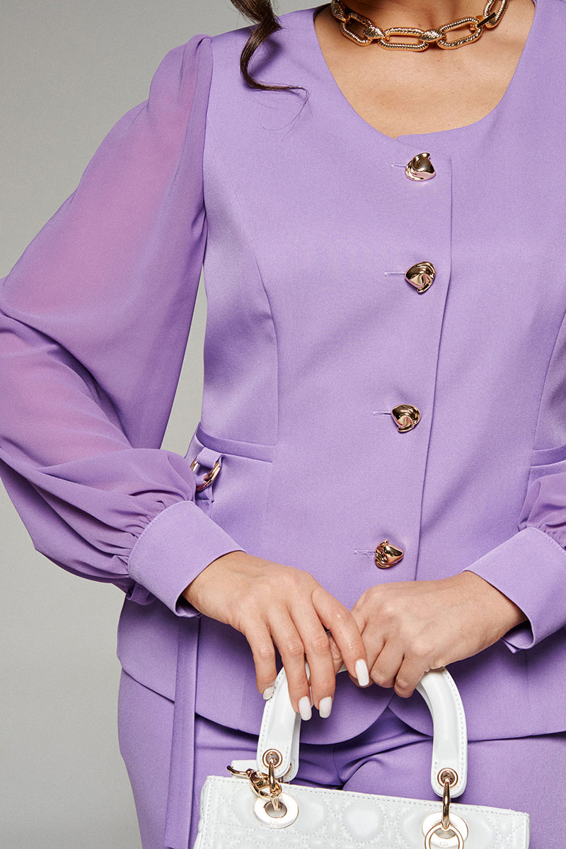 В новом сезоне мы говорим «да» струящимся материалам. Нарядный комплект из жакета и брюк сочетает костюмное полотно с воздушным шифоном и удовлетворит самые изысканные вкусы.