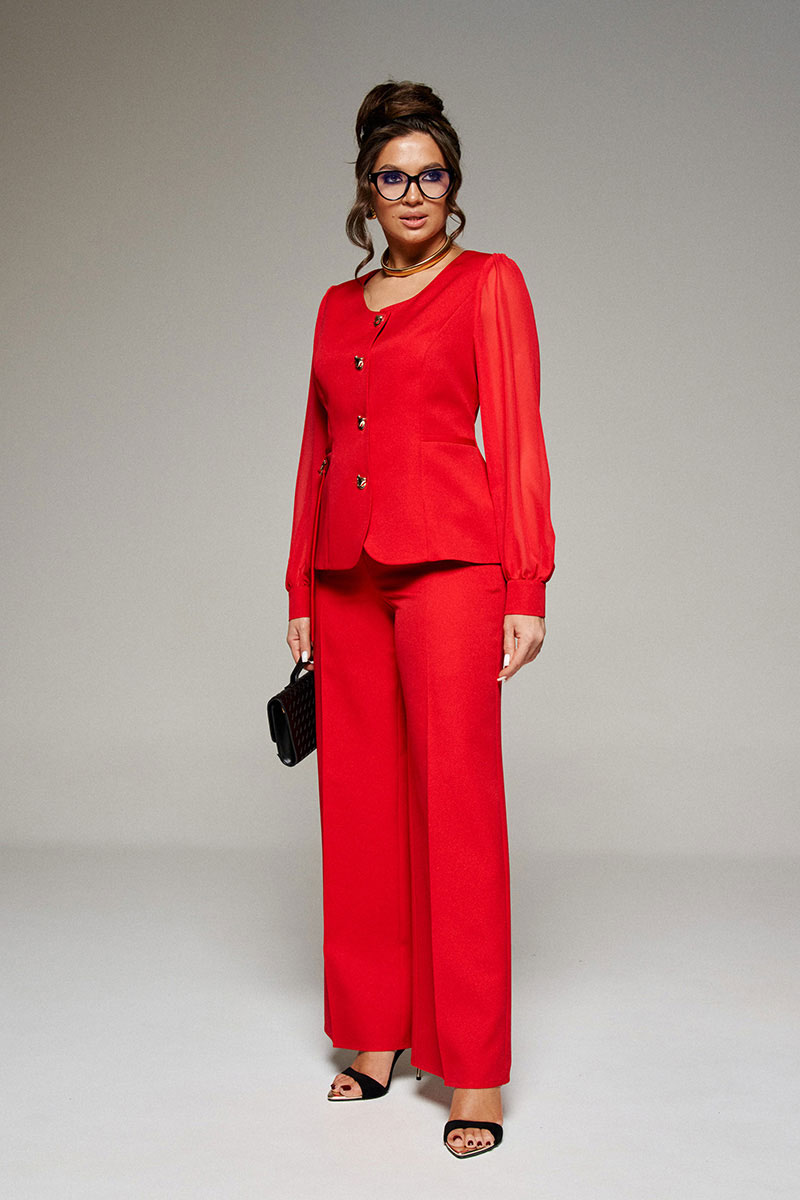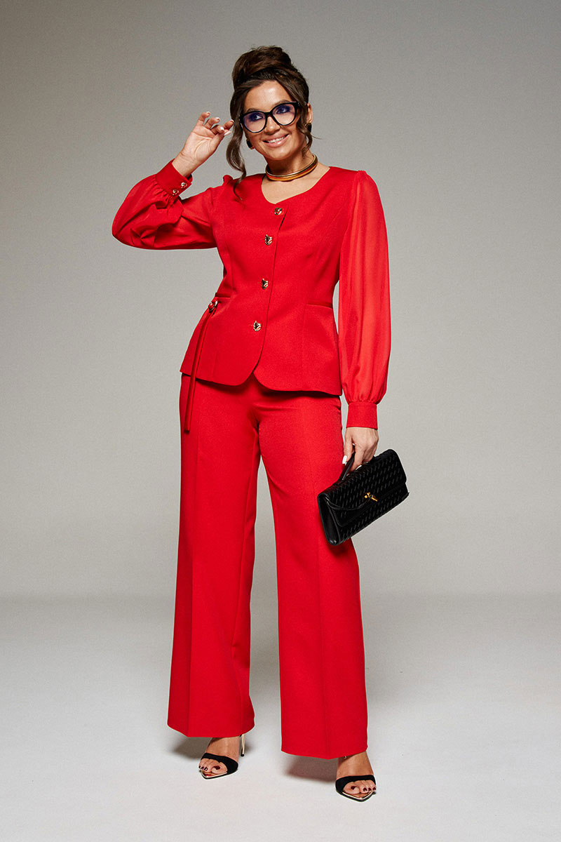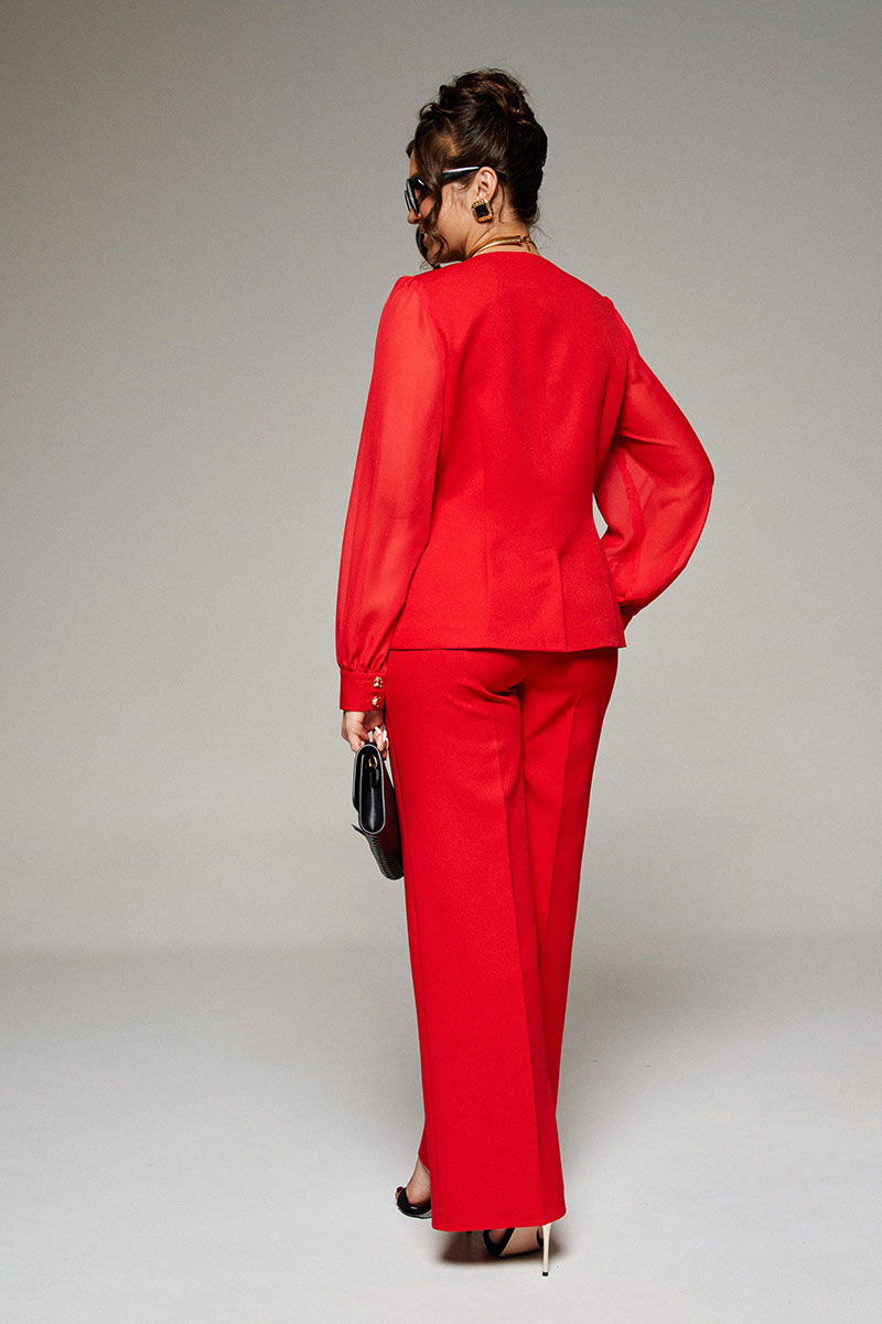 В новом сезоне мы говорим «да» струящимся материалам. Нарядный комплект из жакета и брюк сочетает костюмное полотно с воздушным шифоном и удовлетворит самые изысканные вкусы.