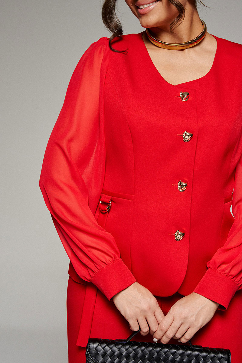 Жакет выполнен из смесового полотна с бархатистой поверхностью, отличается элегантным и утонченным внешним видом, в сочетании с шифоновыми рукавами выглядит дорогим и роскошным.