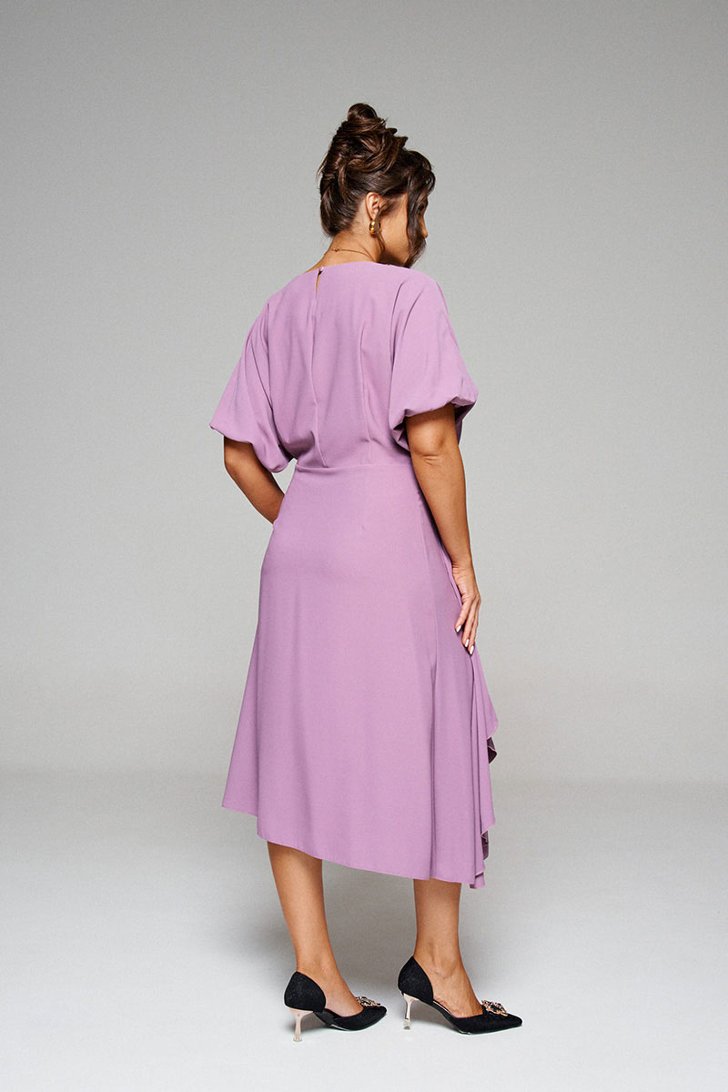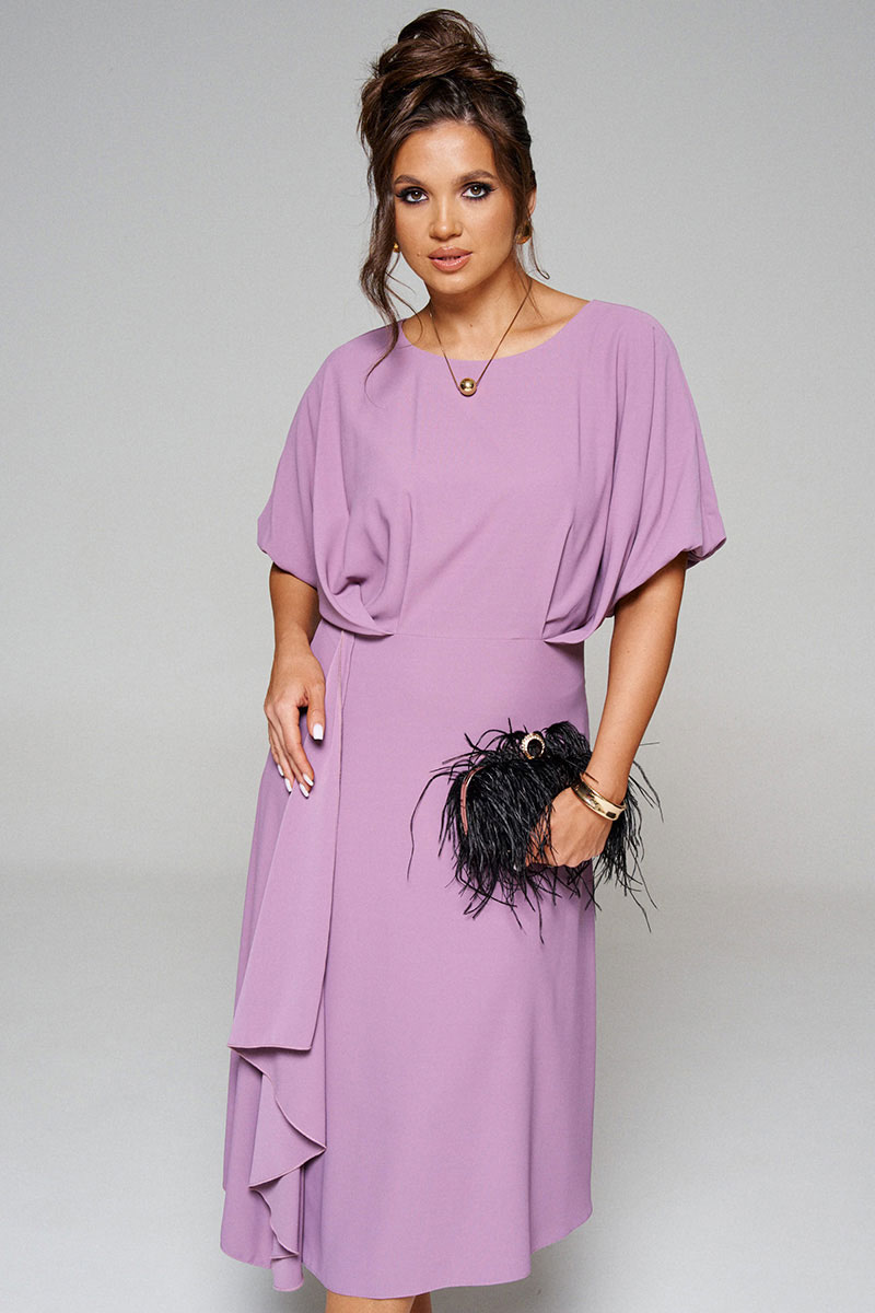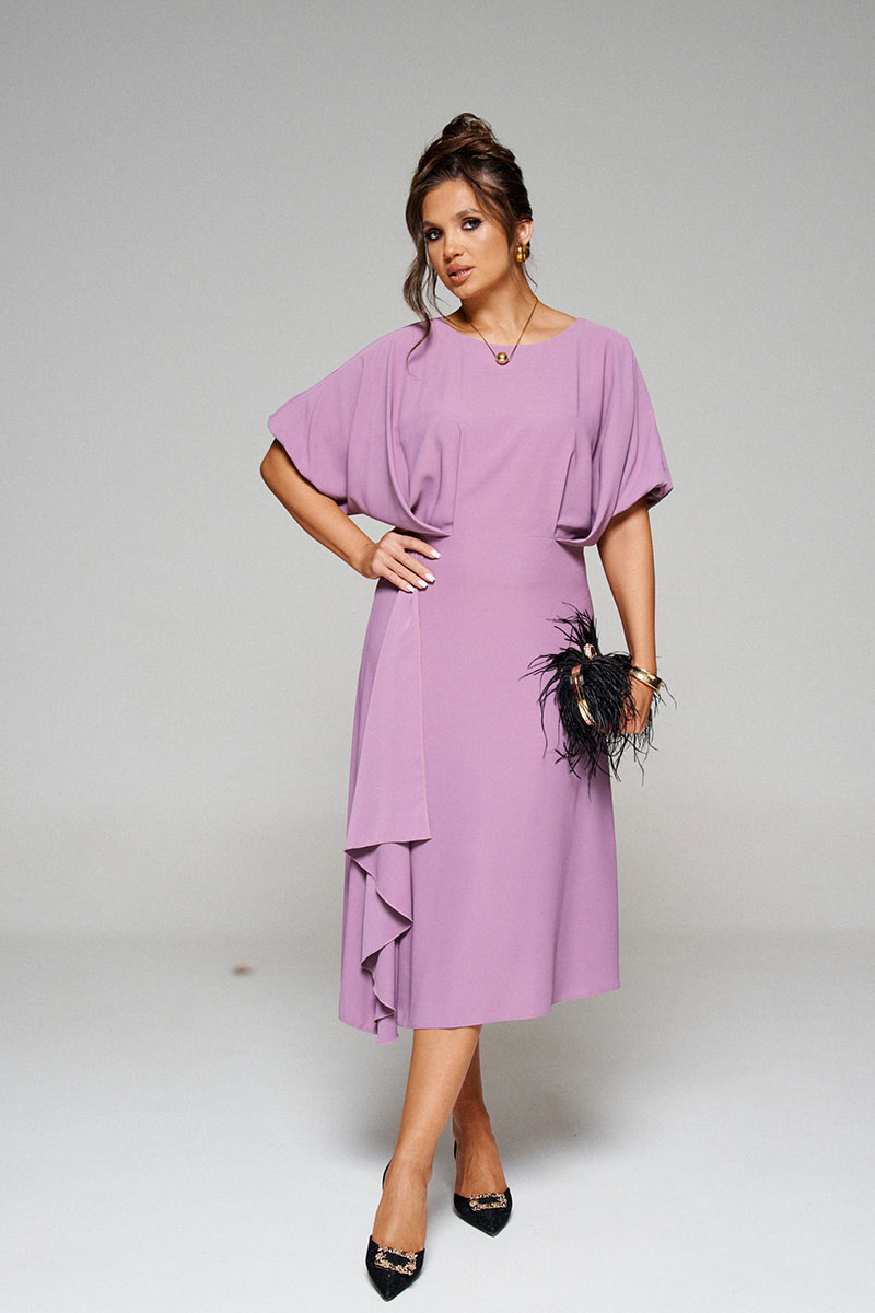 Конструкция верхней части платья выполнена в свободном стиле со спущенной линией плеча и глубокими складками на линии талии спереди.