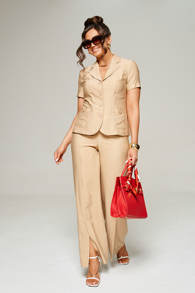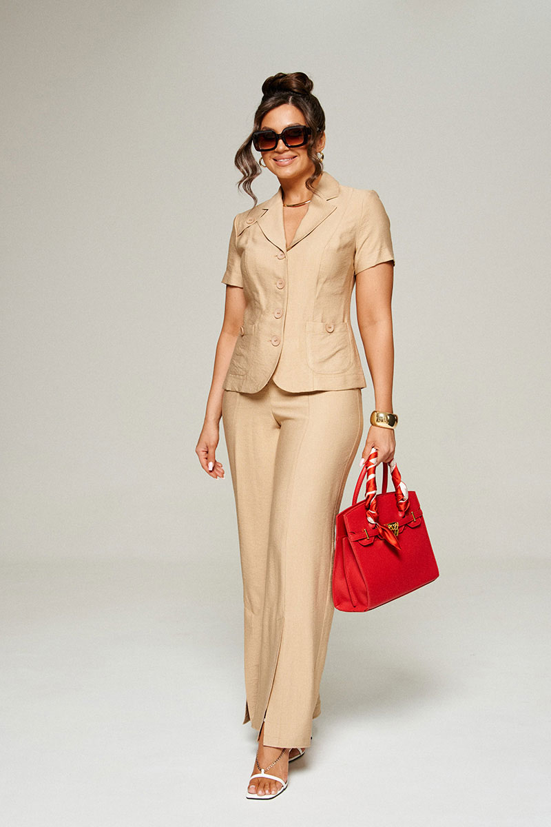 Классический с деловым акцентом женский костюм из жакета и брюк, выполнен из смесовой ткани с добавлением натуральных волокон.