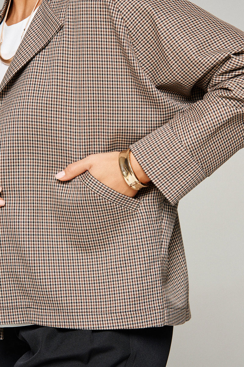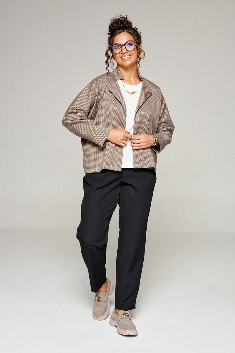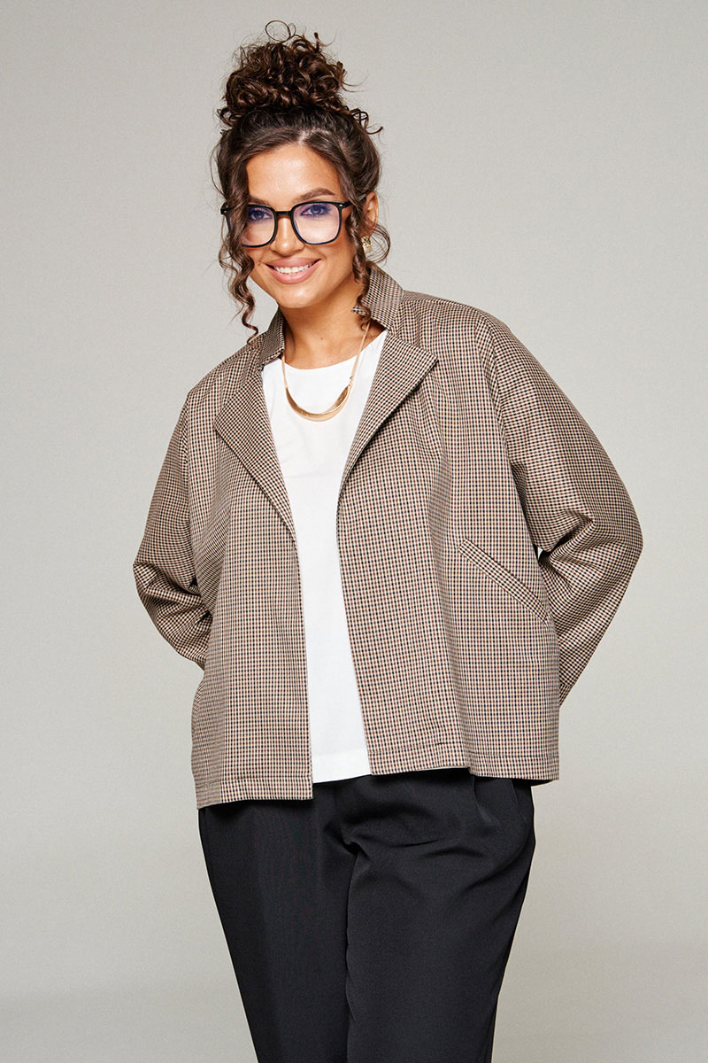 Жакет свободного силуэта выполнен из смесового костюмного полотна актуального дизайна.