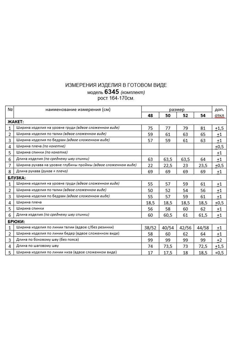 - Состав: жакет: вискоза 89%; акрил 8%; эластан 3%; блуза: ПЭ 68%; вискоза 27%; спандекс 5%; брюки: вискоза 60%; ПЭ 37%; спандекс 3%