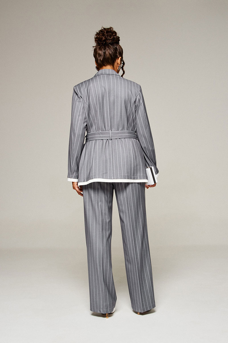 Жакет классический двубортный прямого силуэта длиной ниже бедер и с декоративными элементами в виде контрастных беек. К жакету прилагается пояс-завязка.