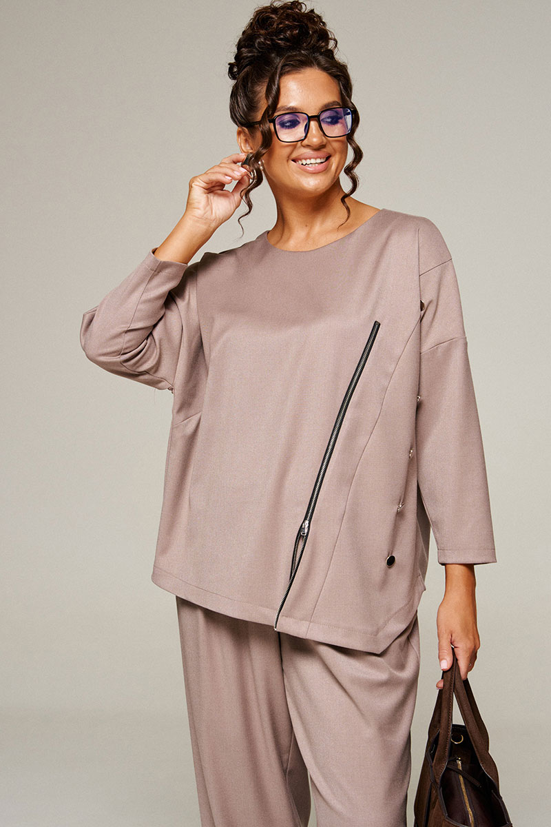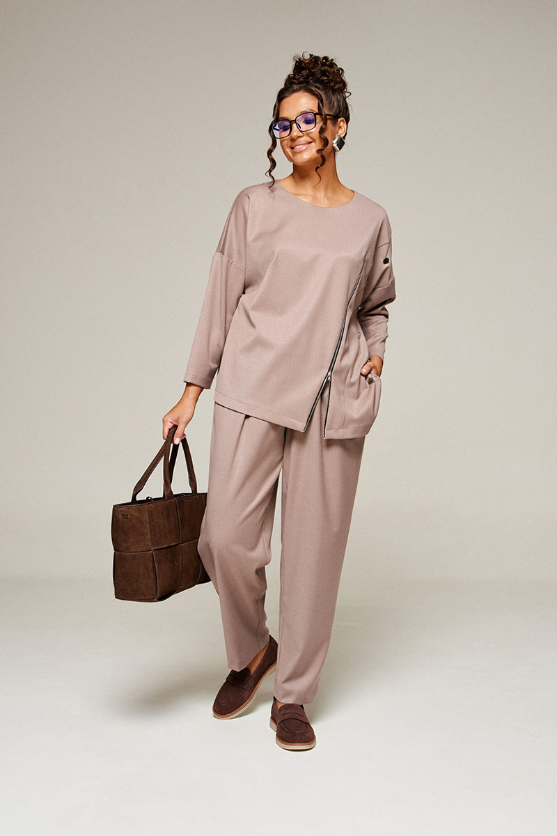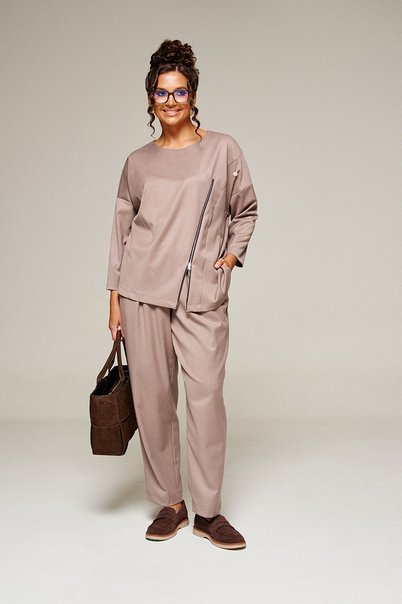Костюм состоит из 2-х предметов одежды: блузона и брюк. Выполнен из костюмной ткани, мягкой и приятной на ощупь, актуальной расцветки.
