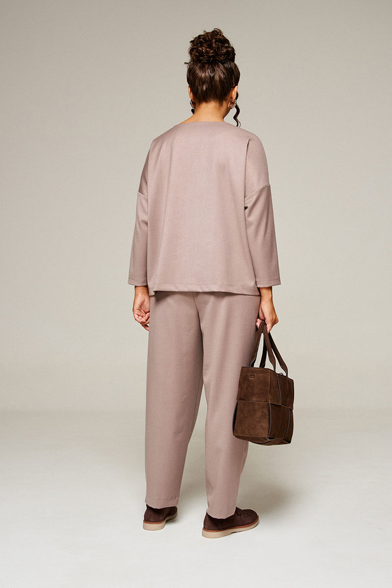 Брюки свободного силуэта расширенные вверху и слегка зауженные внизу, длиной до щиколотки, с двумя верхними боковыми карманами и двумя заложенными глубокими складками от пояса спереди.