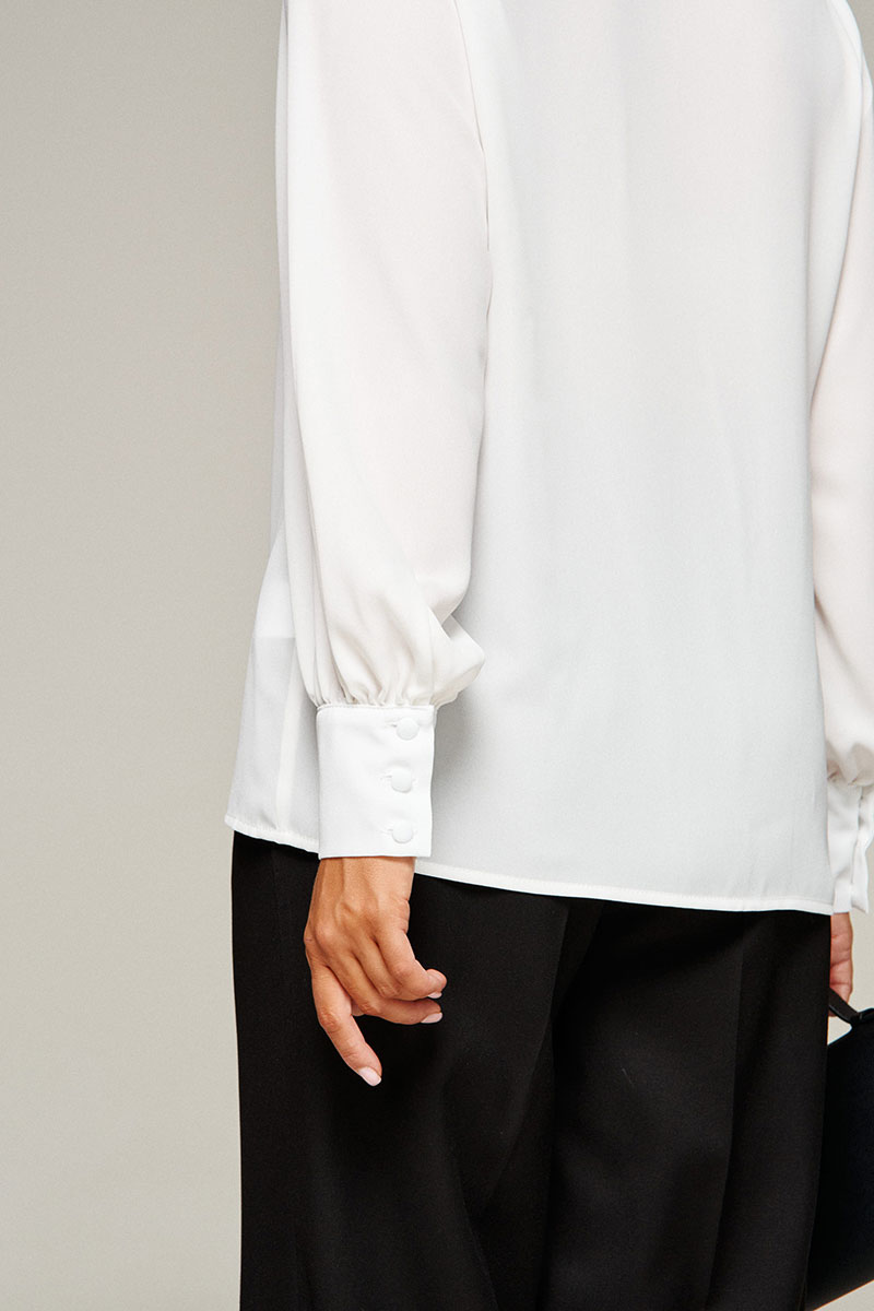 Рукав втачной, длинный, одношовный с мягкими складками по окату. Нижняя часть рукава обработана манжетой с застежкой на три петли и пуговицы.