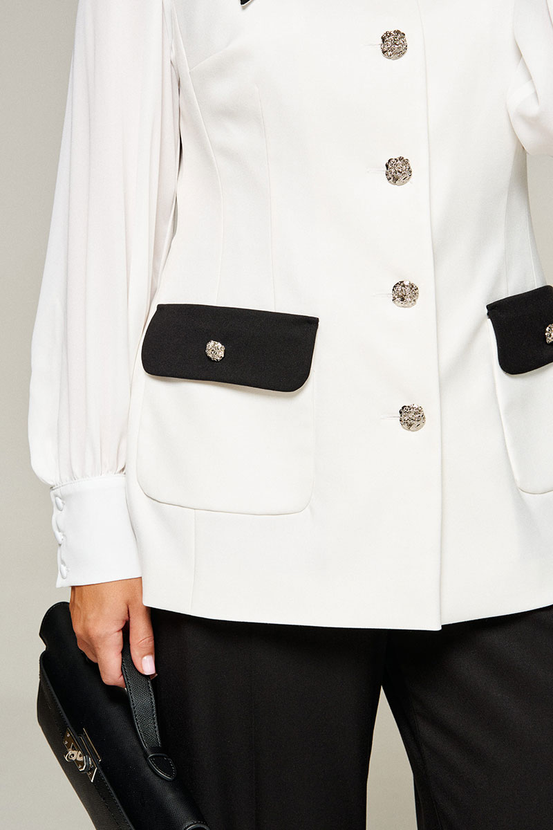 Горловина V-образная. Застежка центральная на петли и пуговицы. Низ борта прямой, низ ровный.