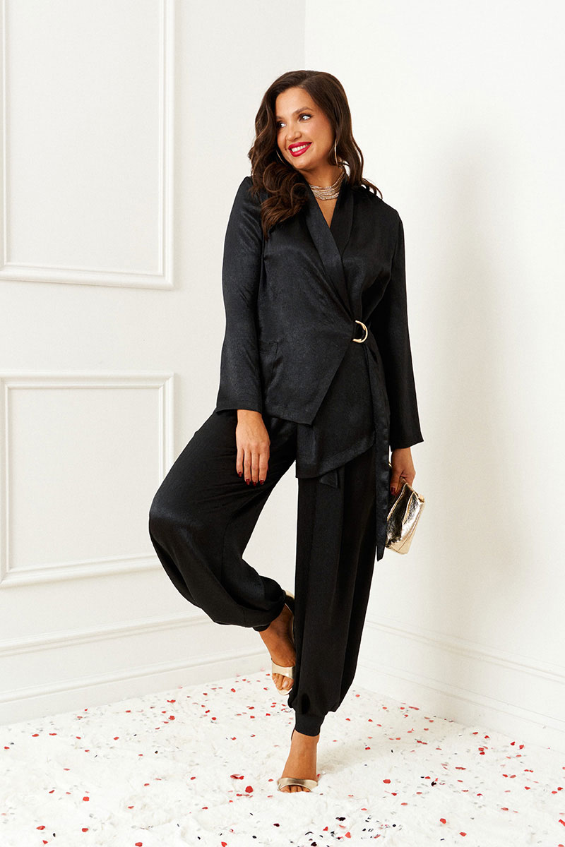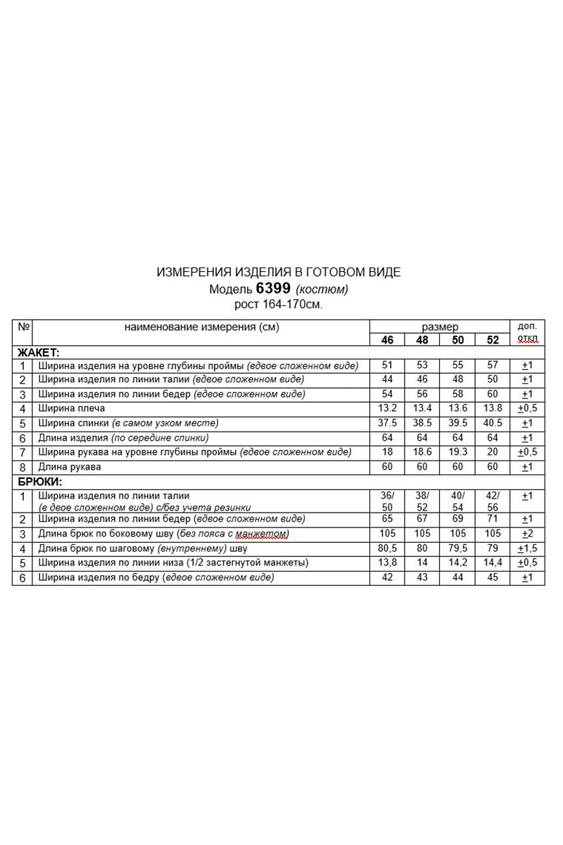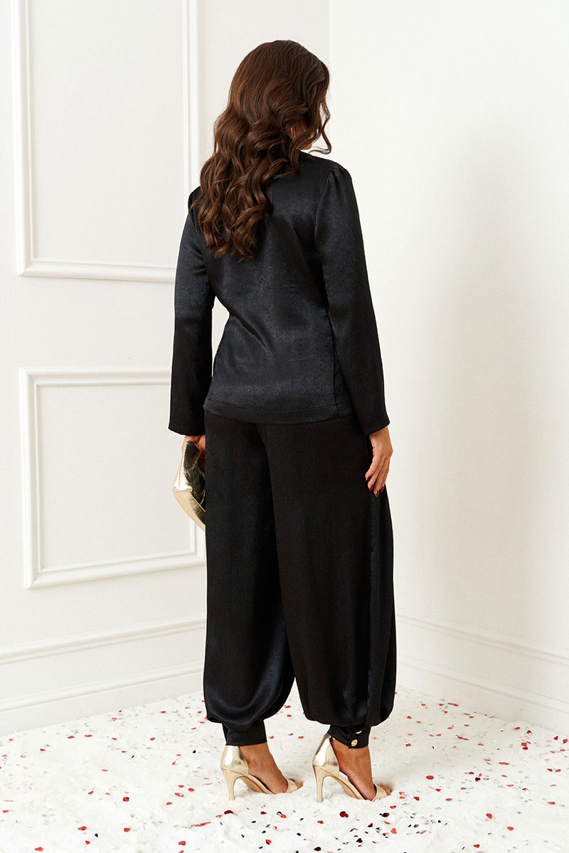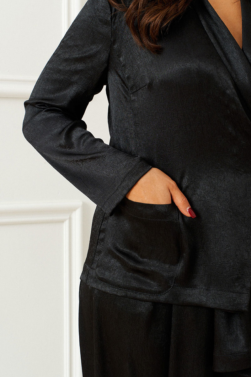 Костюм состоит из 2-х предметов одежды: жакета и брюк. Выполнен из атласной ткани стильного дизайна крэш.