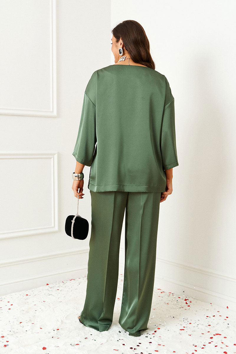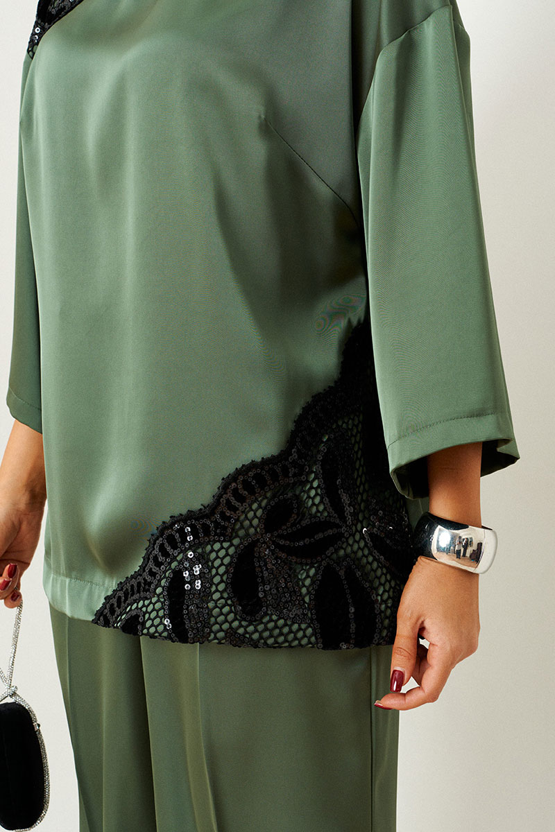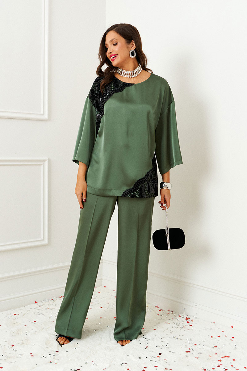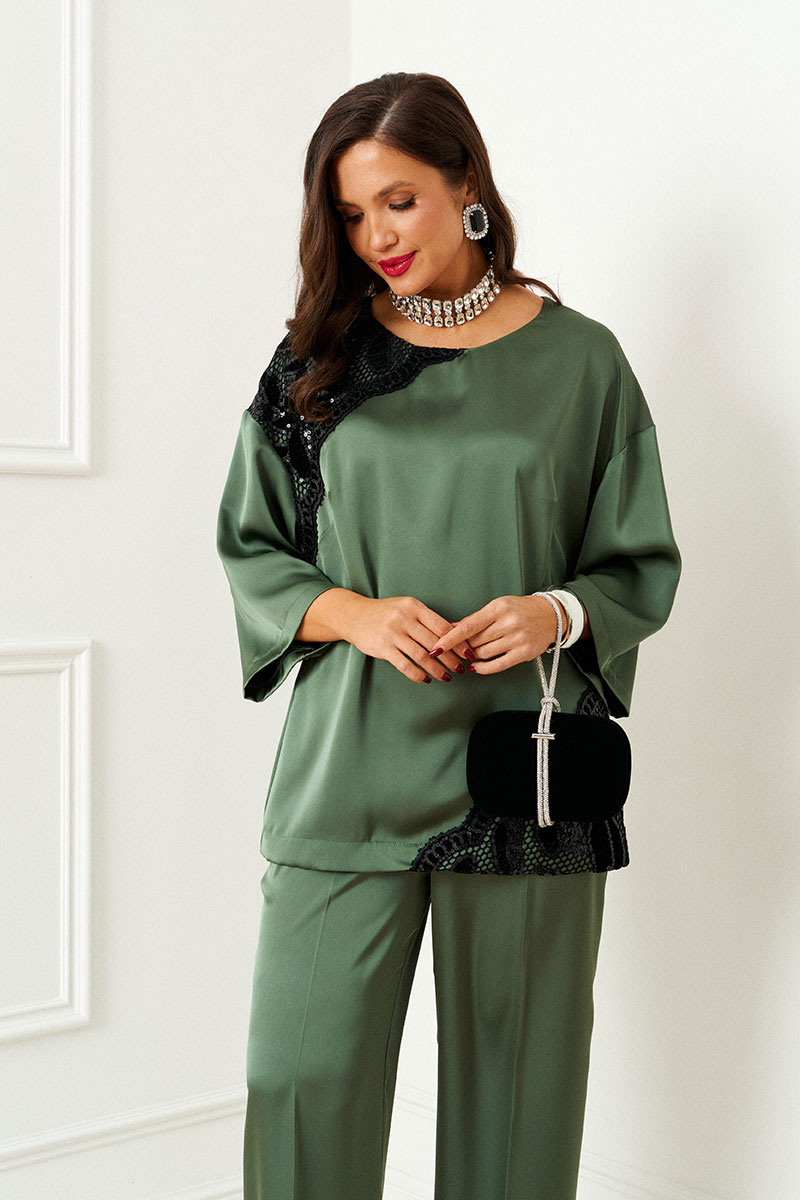 Изысканный костюм состоит из 2-ух предметов: блузки и брюк. Выполнен из атласного полотна в сочетании с кружевом. Основная ткань нежная, гладкой фактуры, приятная на ощупь и с блестящей поверхностью, она легко драпируется и очень выгодно и дорого подчёркивает образ; отделочная ткань придает праздничный шарм.