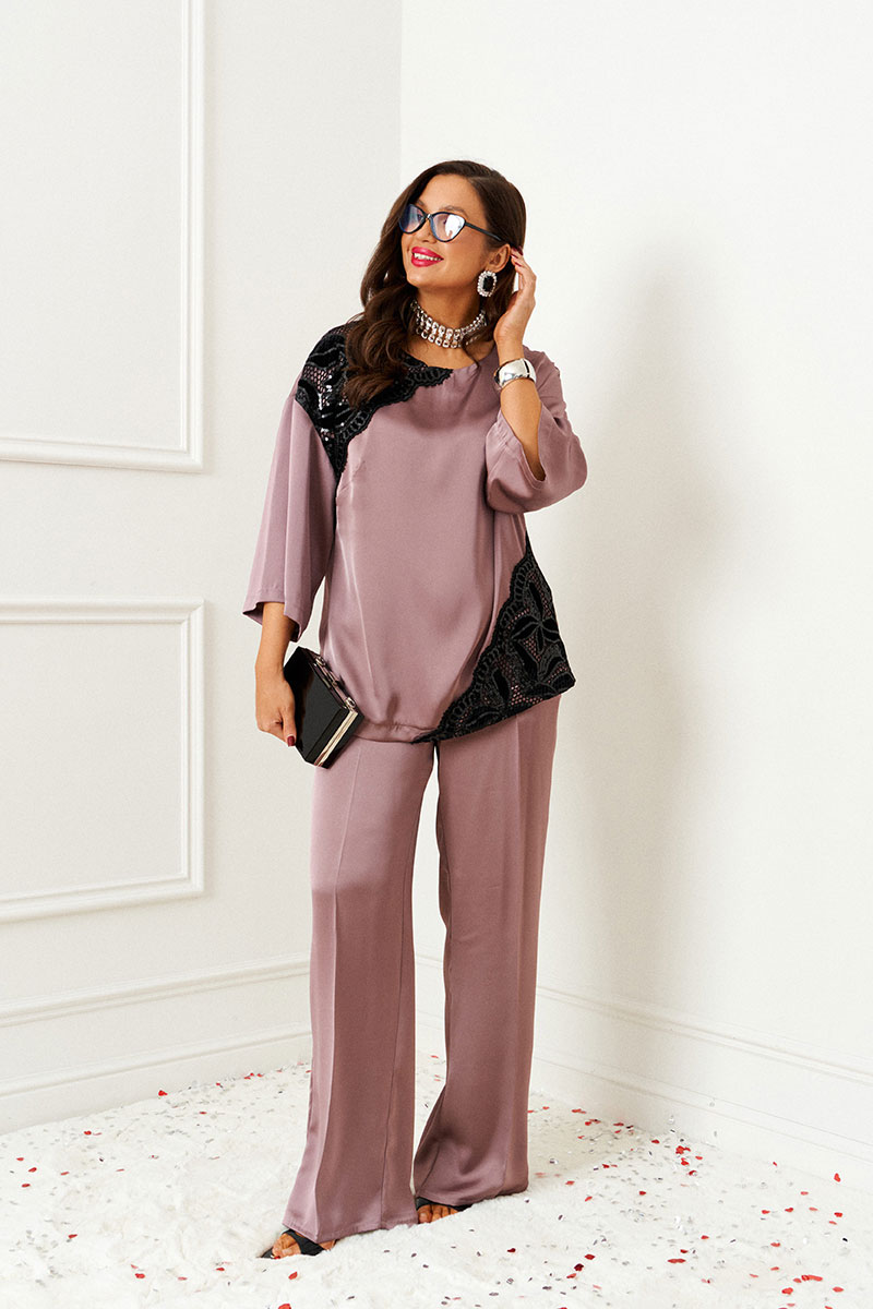 Изысканный костюм состоит из 2-ух предметов: блузки и брюк. Выполнен из атласного полотна в сочетании с кружевом. Основная ткань нежная, гладкой фактуры, приятная на ощупь и с блестящей поверхностью, она легко драпируется и очень выгодно и дорого подчёркивает образ; отделочная ткань придает праздничный шарм.