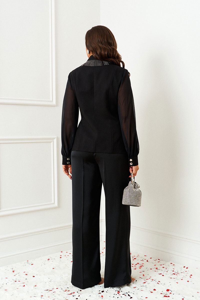 Костюм женский 2-ух предметный: жакет и брюки в деловом стиле. Выполнен в комбинации изысканных костюмного, атласного и шифонового полотен, а также декорирован эксклюзивной цепочной тесьмой.
