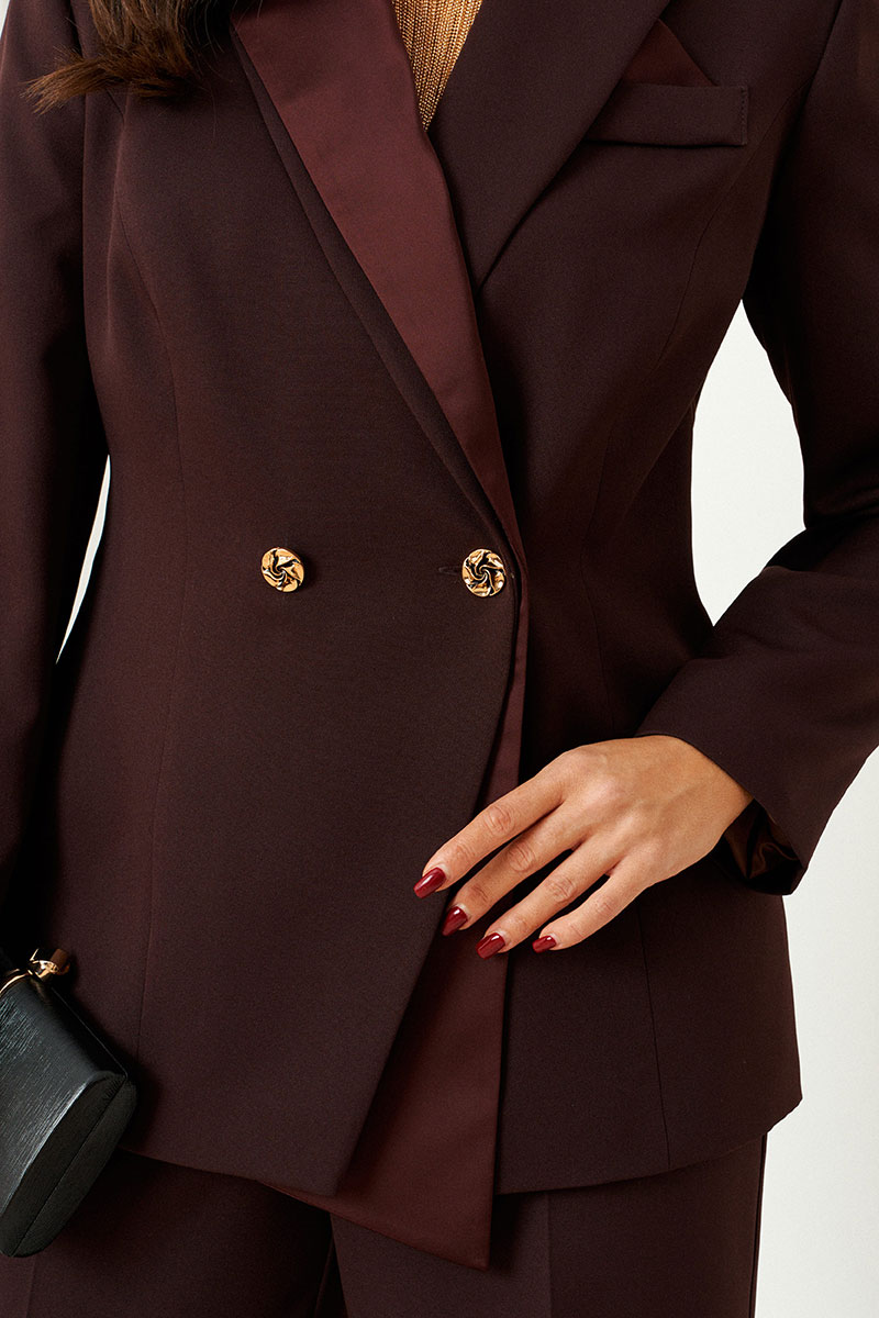 Костюм женский 2-ух предметный: жакет и брюки в деловом стиле. Выполнен из костюмной ткани в сочетании с атласным полотном нежной и блестящей фактуры.