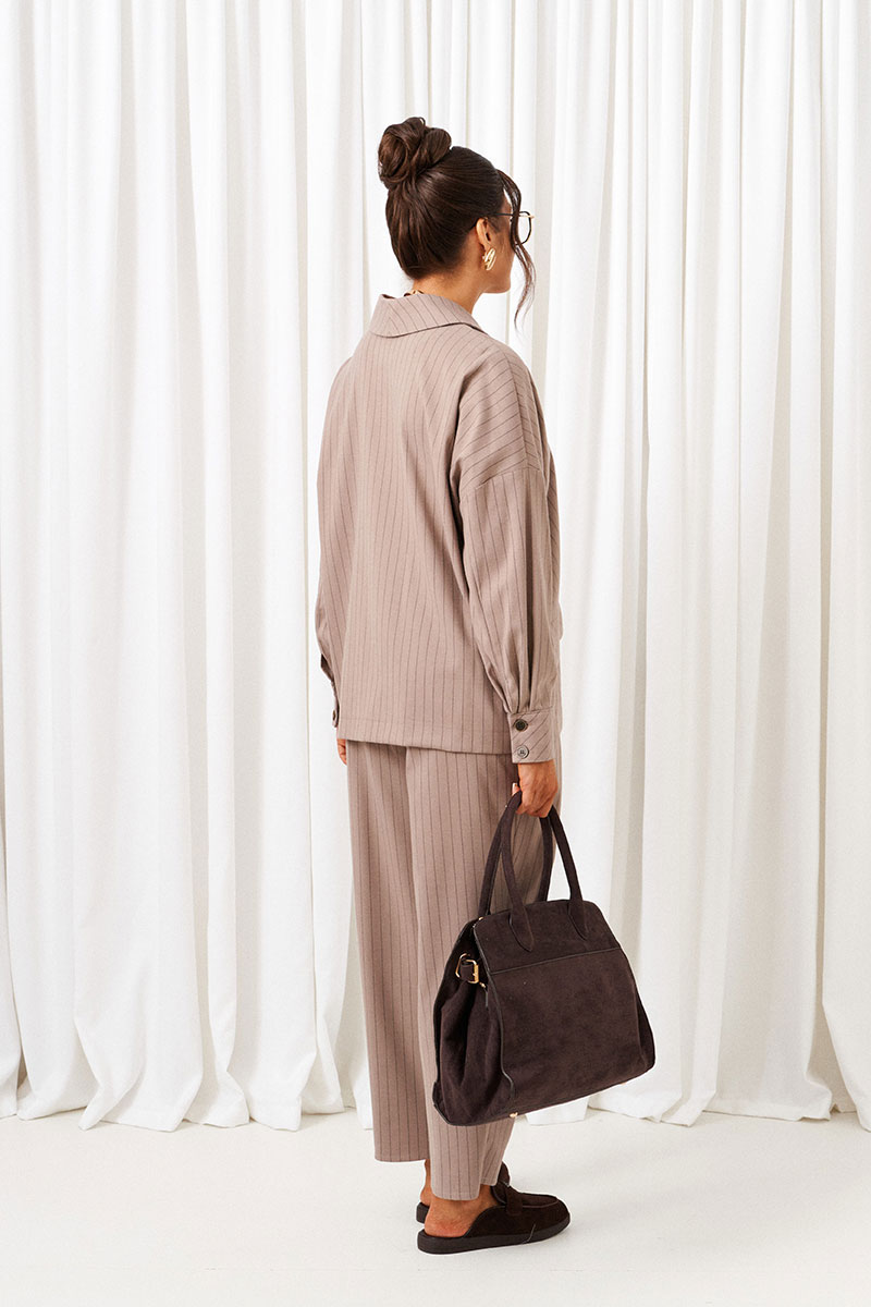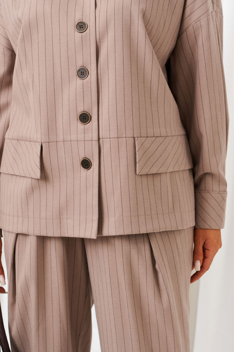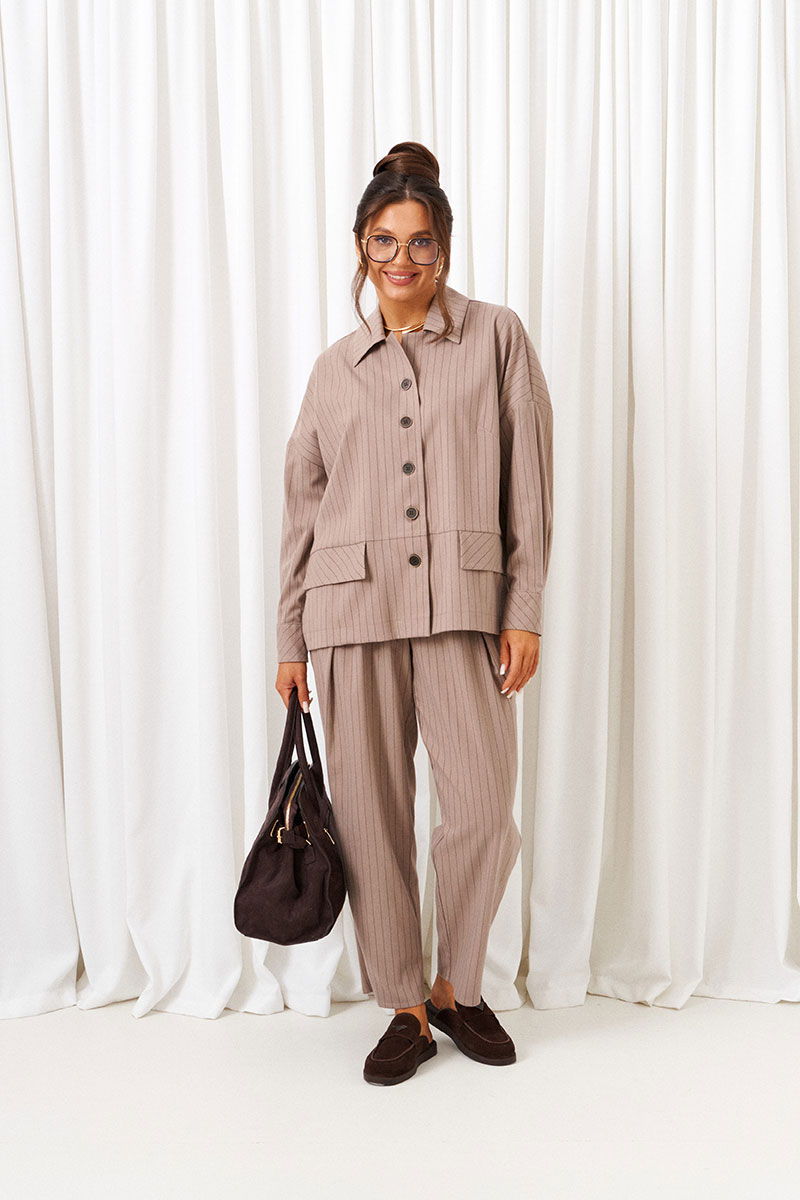Костюм состоит из 2-предметов одежды: рубашки и брюк. Выполнен из костюмной ткани стильного дизайна в полоску.
