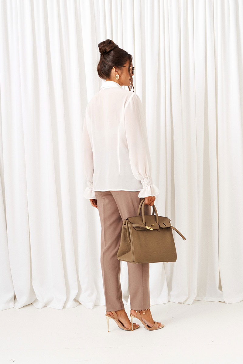 Блузка рубашечного типа выполнена из легкой, струящейся шифоновой ткани.