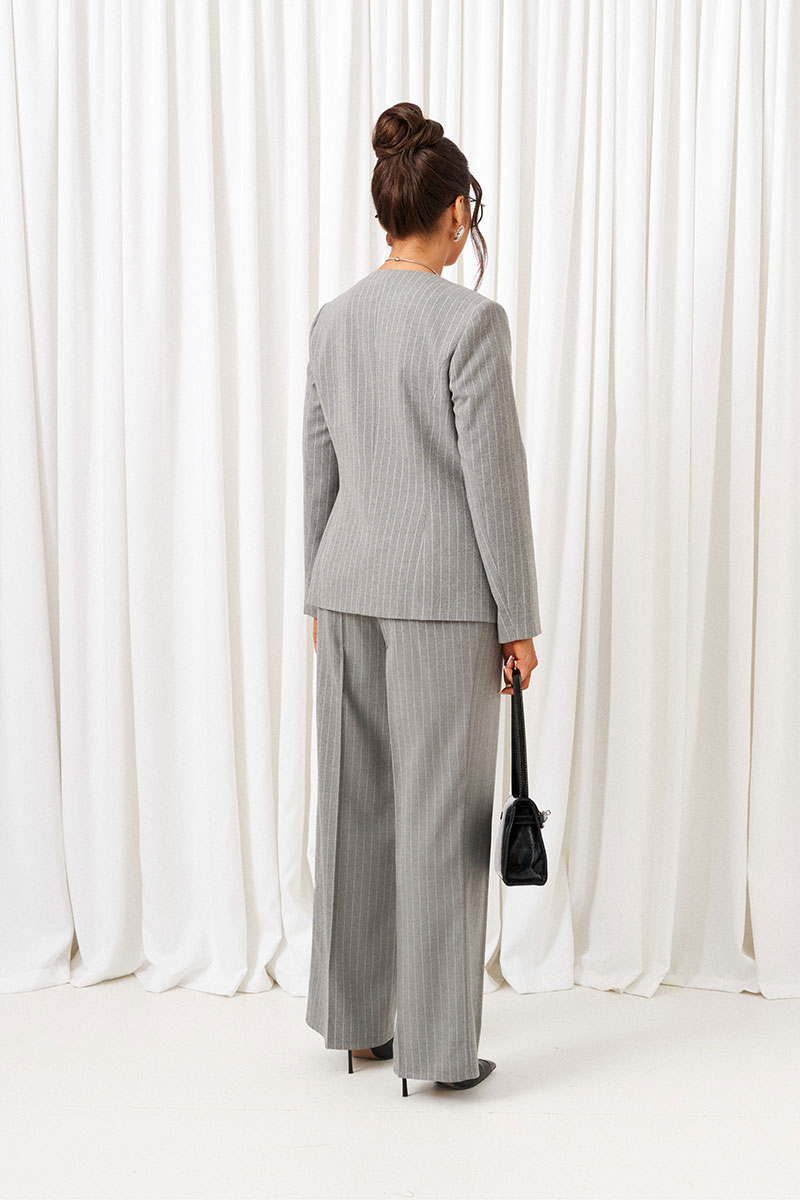 Комплект женский 3-ка, состоящий из жакета, брюк и блузки. Предназначен для повседневного использования. Жакет и брюки выполнены из костюмной ткани высокого качества нежной фактуры, приятной на ощупь, и актуального дизайна в полоску. Блузка изготовлена из вискозного полотна с содержанием натуральных волокон.