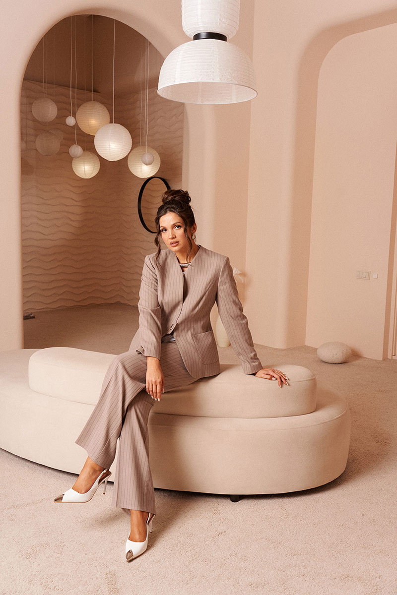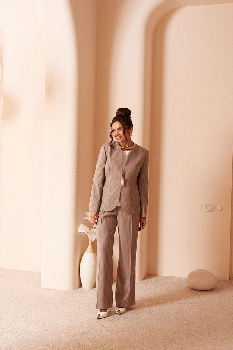 - Состав: жакет; брюки: вискоза 61%; ПЭ 22%; ПАН 14%; эластан 3%; блуза: ПЭ 68%; вискоза 27%; спандекс 5%