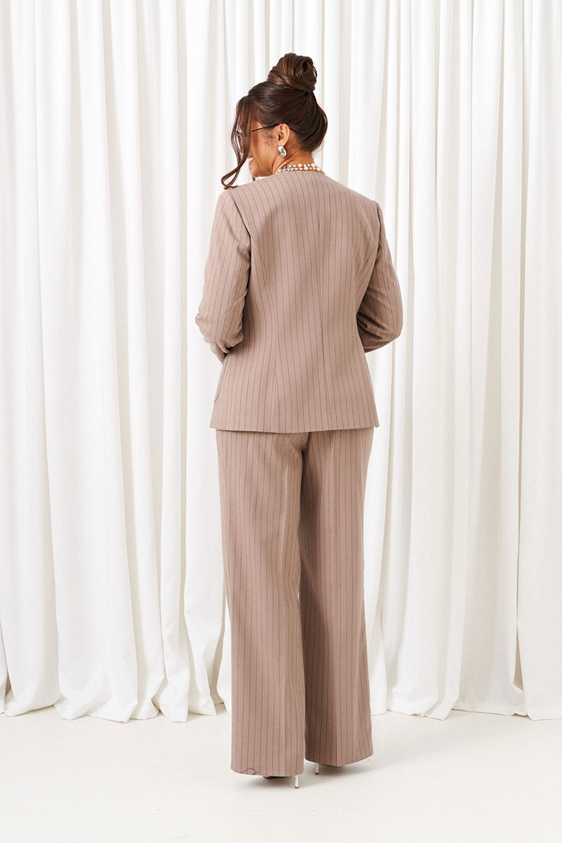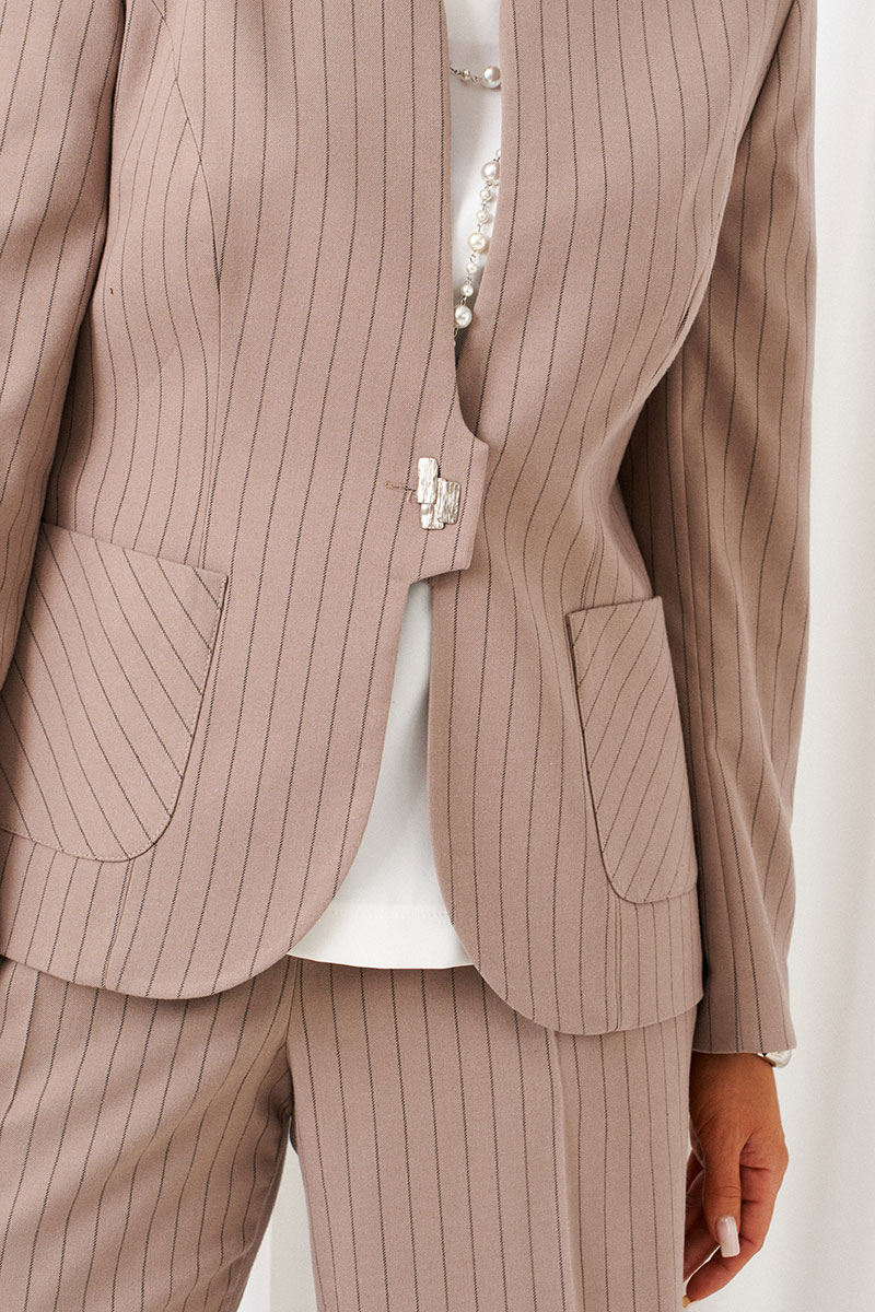 Комплект женский 3-ка, состоящий из жакета, брюк и блузки. Предназначен для повседневного использования. Жакет и брюки выполнены из костюмной ткани высокого качества нежной фактуры, приятной на ощупь, и актуального дизайна в полоску. Блузка изготовлена из вискозного полотна с содержанием натуральных волокон.