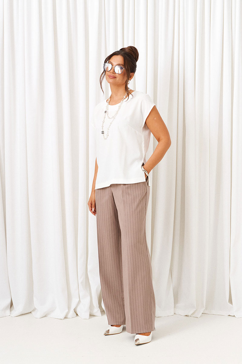 Брюки прямого силуэта классической посадки, длинные, с двумя верхними боковыми карманами и двумя заложенными глубокими складками от пояса.