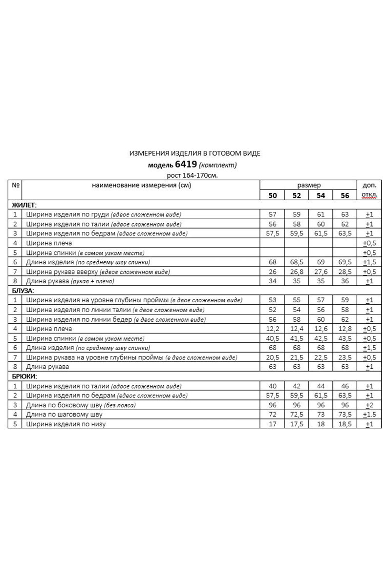 - Состав: жилет: вискоза 89%; акрил 8%; эластан 3%; блуза: ПЭ 75%; вискоза 25%; брюки: вискоза 60%; ПЭ 37%; спнадекс 3%