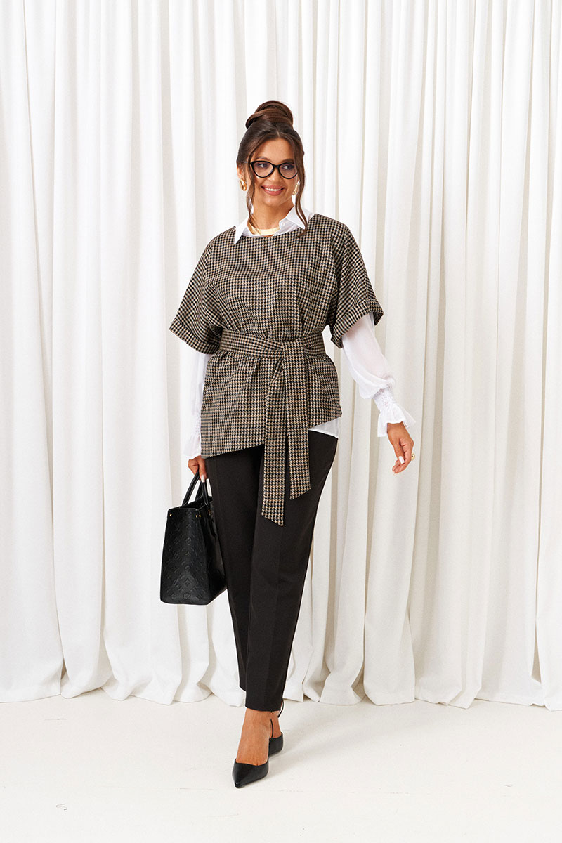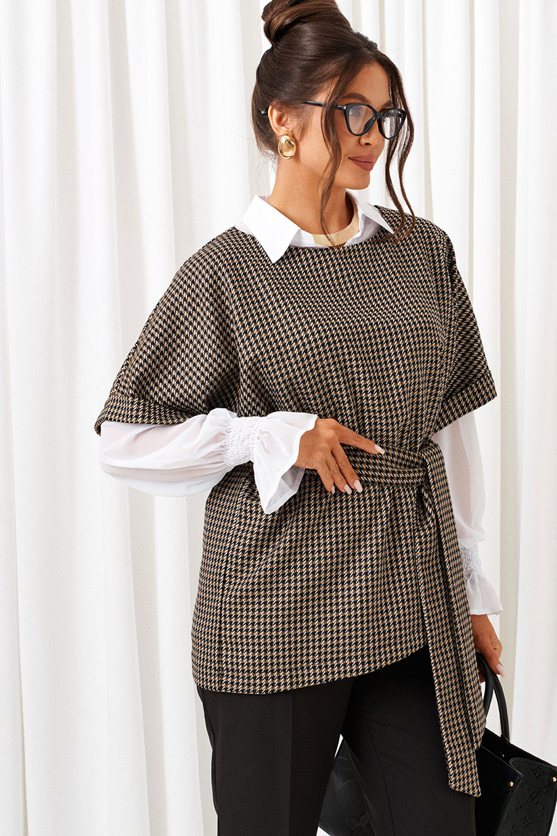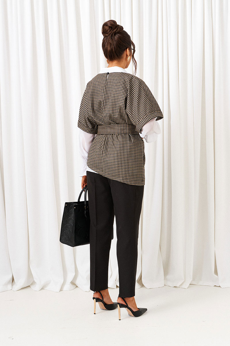 Жилет изготовлен из смесовой ткани с актуальным дизайном ломанной клетки «пье-де-пуль».