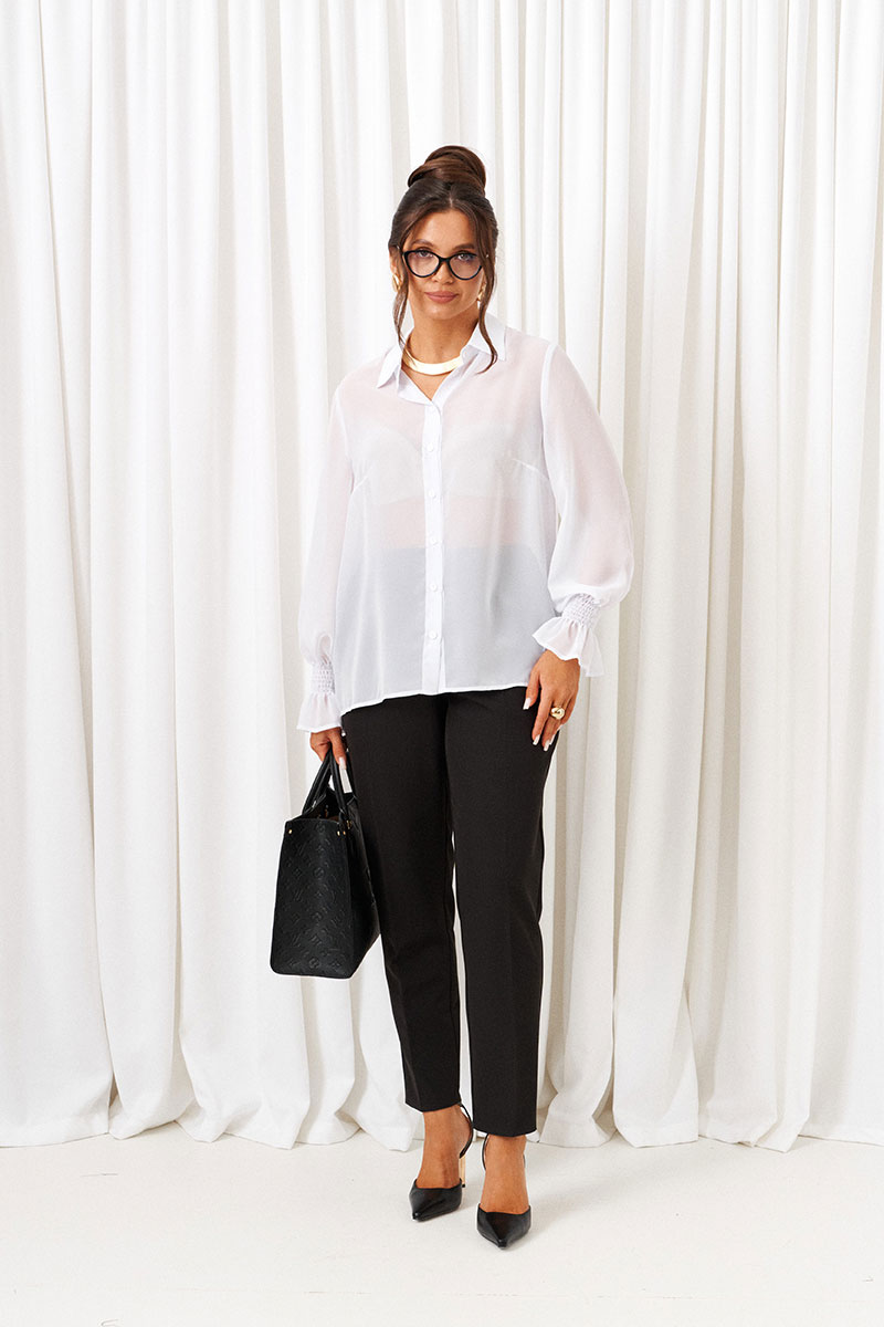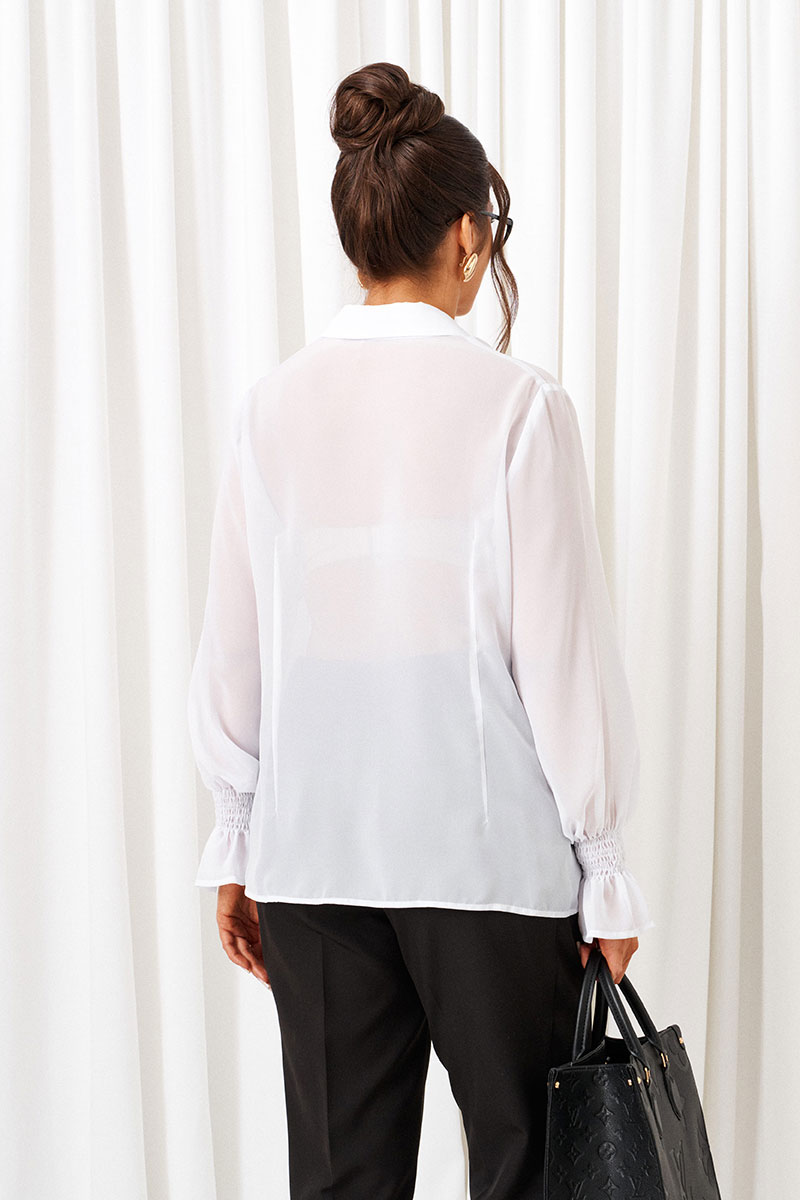 Блузка рубашечного типа выполнена из легкой, струящейся шифоновой ткани.