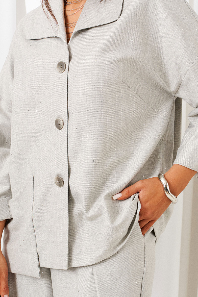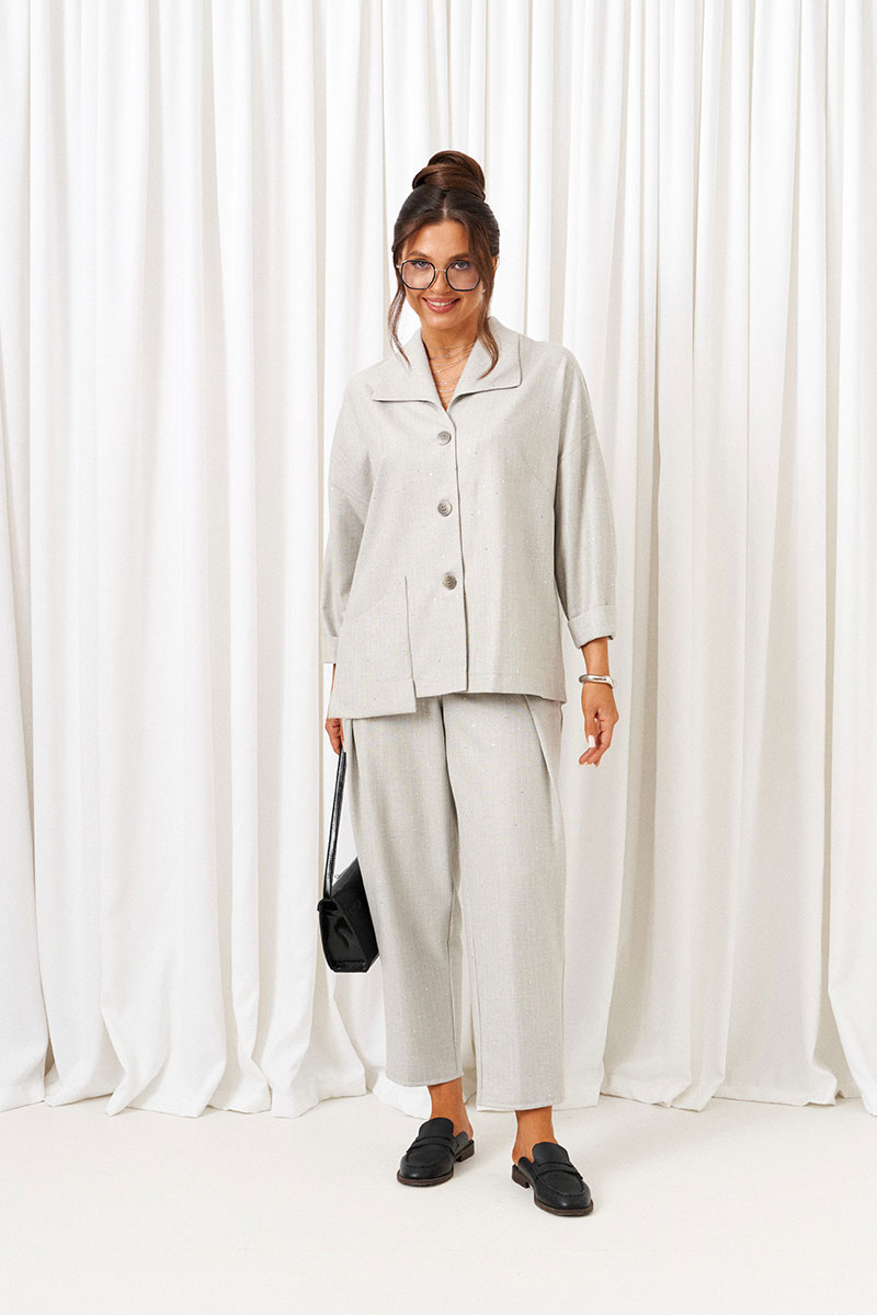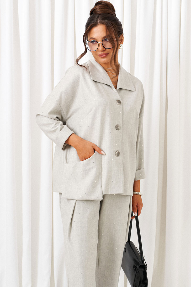 Костюм состоит из 2-х предметов одежды: рубашки и брюк. Выполнен из костюмной ткани стильного дизайна с содержанием натуральных волокон.