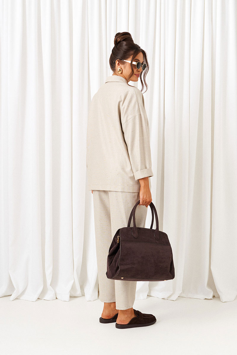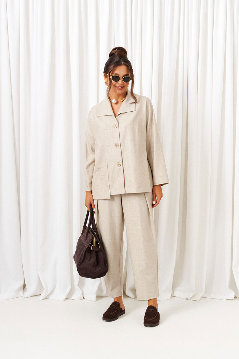 Стильный повседневный женский костюм в винтажном стиле, дополненный акцентным асимметричным накладным карманом, весьма актуален в будущем сезоне. Предметы костюма можно смело комбинировать по отдельности с другими вещами гардероба.