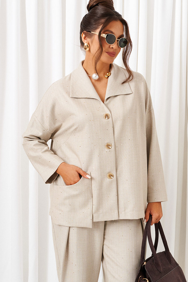 Костюм состоит из 2-х предметов одежды: рубашки и брюк. Выполнен из костюмной ткани стильного дизайна с содержанием натуральных волокон.