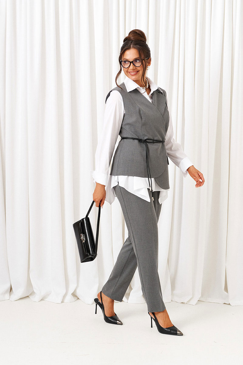 - Состав: жилет; брюки: вискоза 67%; ПЭ 28%; спандекс 5%; блуза: хлопок 100%