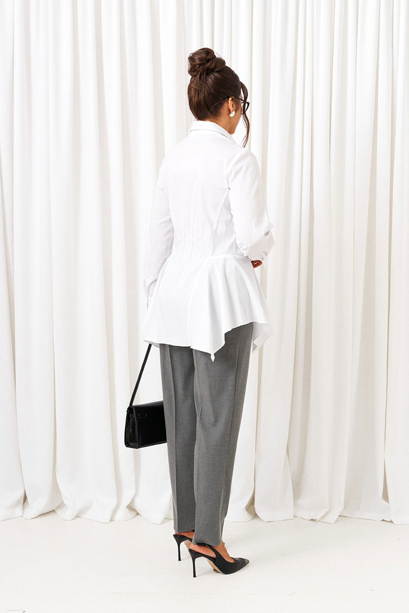 Блузка с декоративными вставками в нижней части, которые задают силуэтное расширение в области бедер. Нижний край блузы неровный.