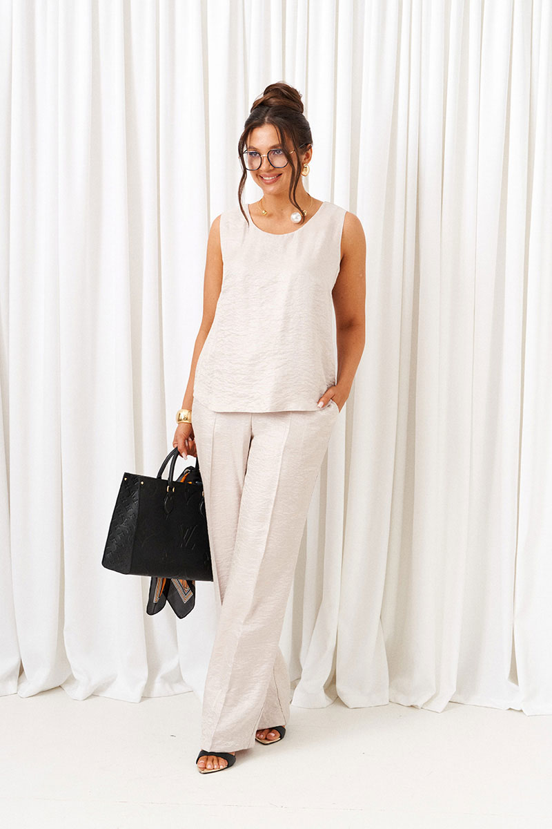 - Состав: блуза: вискоза 50%; ПЭ 45%; нейлон 5%; топ; брюки: вискоза 50%; ПЭ 50%