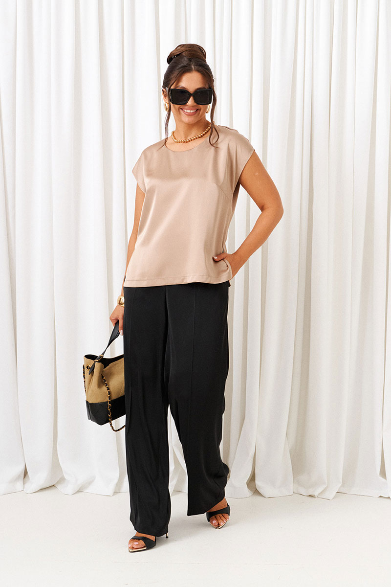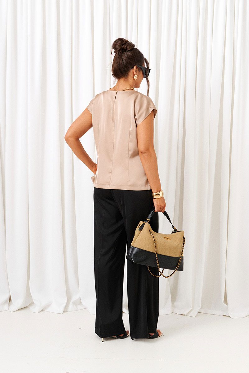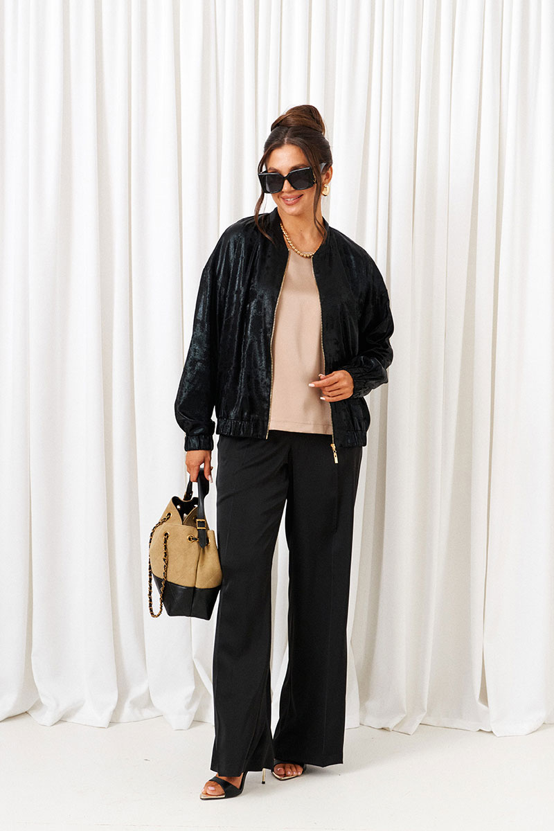 Брючный комплект в комбинации сияющего роскошного атласа с эксклюзивным ворсовым шифоном не останется незаметным!