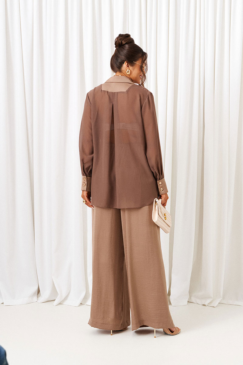 Комплект состоит из 2-х предметов одежды: рубашки и брюк. Выполнен из легких и струящихся тканей мягких оттенков с содержанием натуральных волокон. Брюки и верхняя деталь, имитирующая жилет, из шелковистого полотна. Рубашечная часть комплекта из шифоновой ткани.