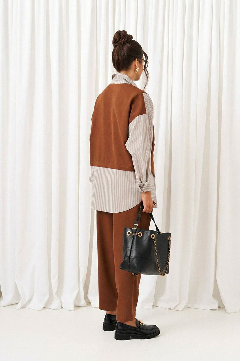 Комплект состоит из 2-х предметов одежды: рубашки и брюк. Выполнен из костюмной и рубашечной тканей стильного актуального дизайна с содержанием натуральных волокон. Брюки и верхняя деталь, имитирующая жилет, из костюмного полотна. Рубашечная часть комплекта из хлопковой ткани «в полоску».