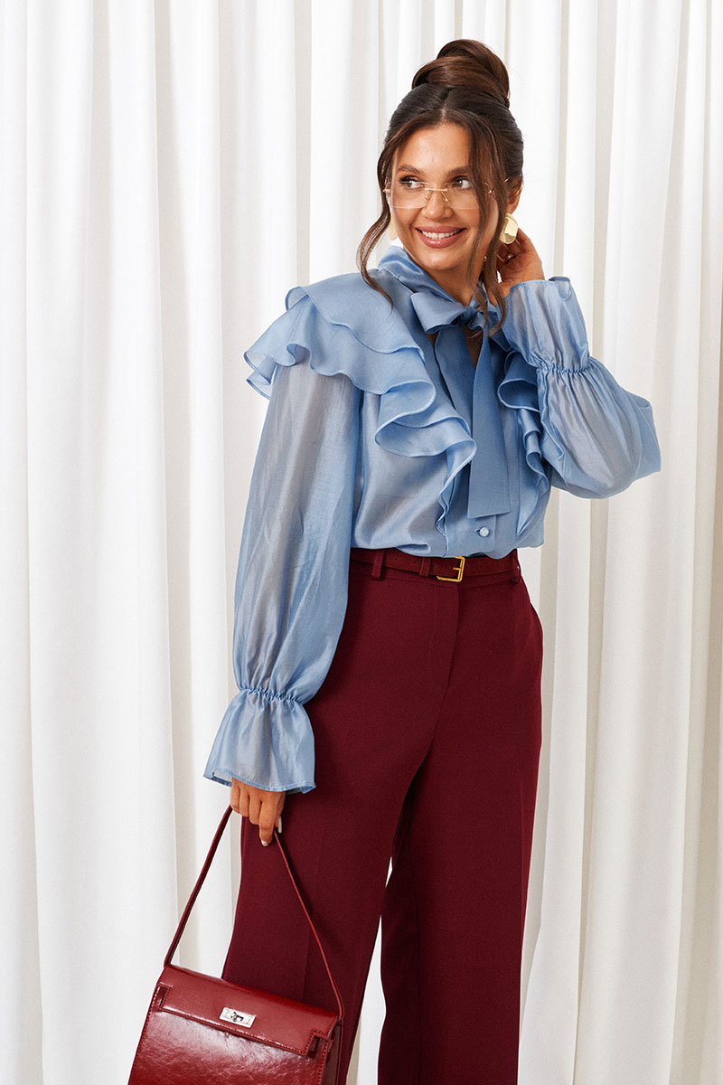 Симфония роскоши и фактур! Сочетание экстравагантной блузы и широких брюк создает гармоничный силуэт, подчеркивая неповторимость образа.